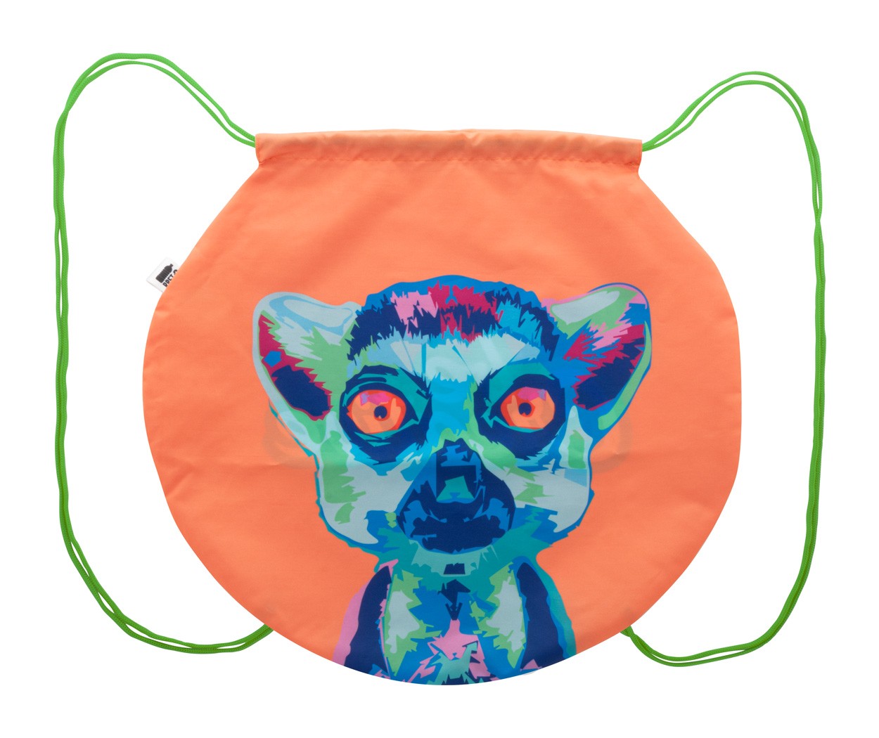 Geantă personalizată, cu șnur, în formă de bilă, din poliester 190T RPET. Cu grafică imprimată prin sublimare și etichetă RPET distinctivă. MOQ: 25 buc.