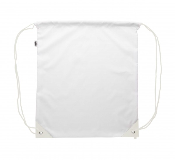 Rucsac, personalizat, cu cordon, cu colțuri din piele PU ranforsată și barete de culoare asortate, din poliester RPET 190T. Cu grafică imprimată pe toată suprafața prin sublimare și etichetă RPET distinctă. MOQ: 25 buc.