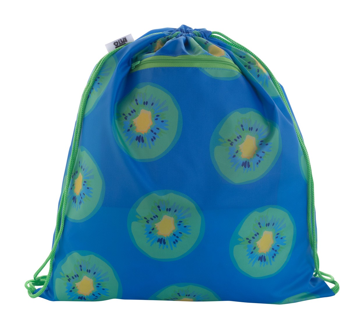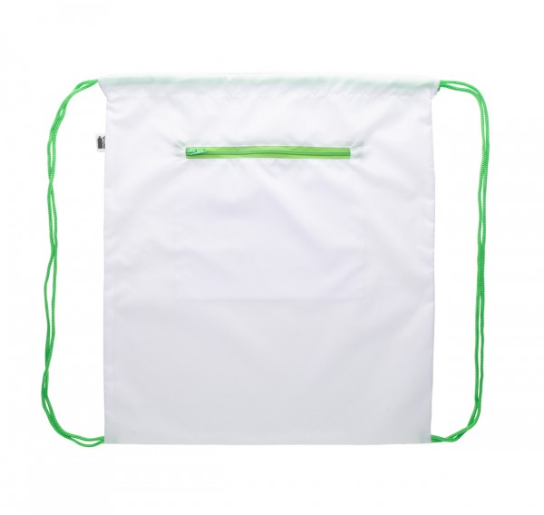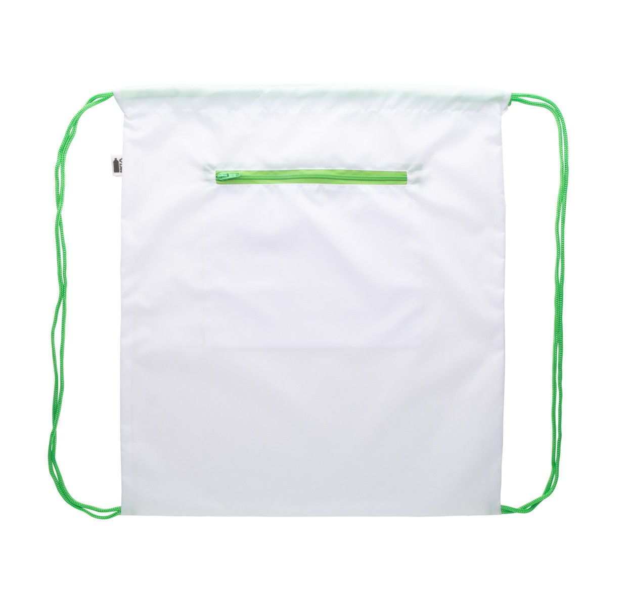 Geantă personalizată cu șnur cu fermoar, buzunar frontal protejat RFID, poliester 190T RPET. Cu grafică imprimată prin sublimare și etichetă RPET distinctivă. MOQ: 25 buc.