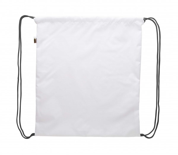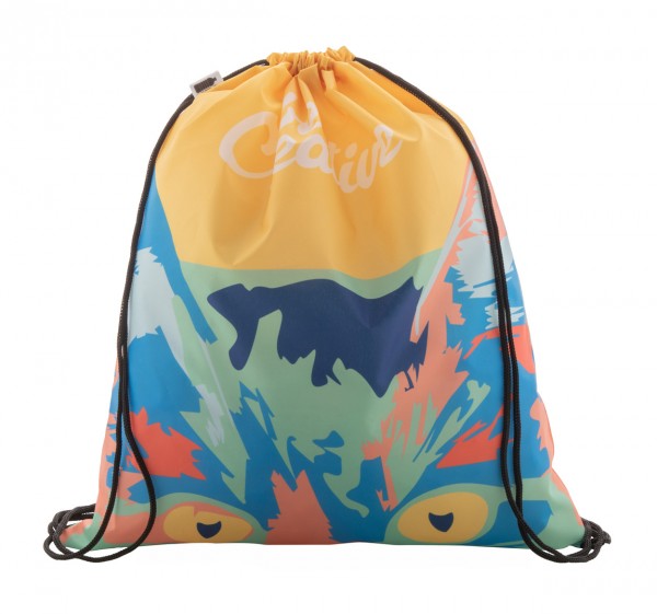 Rucsac drawstring personalizat, cu snur colorat, din poliester RPET 190T. Cu sublimare pe toata suprafata. Cu etichetă distinctă RPET. Cantitate minima de comanda 25 buc.