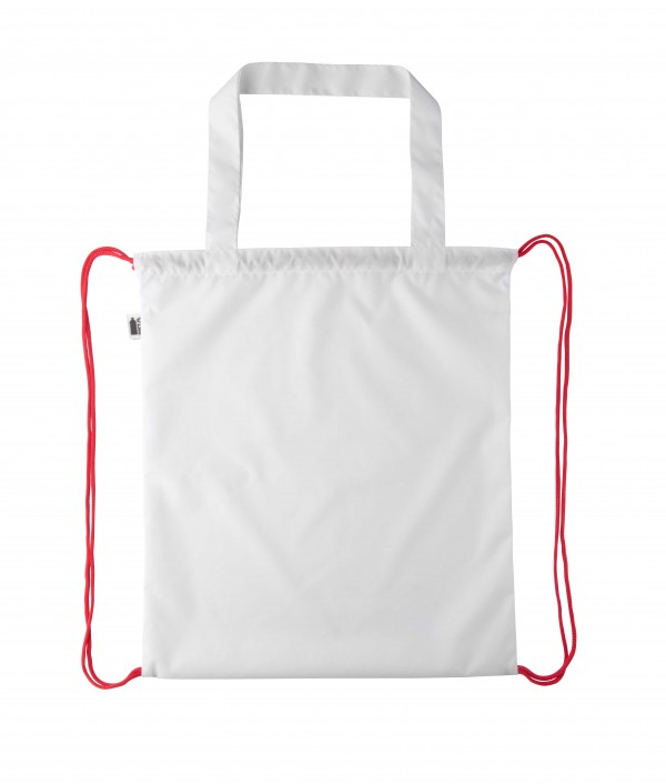 Geantă personalizată, cu șnururi colorate și mânere lungi, poliester RPET 190T. Poate fi folosită și ca geantă de cumpărături. Cu grafică imprimată pe toată suprafata prin sublimare și etichetă RPET distinctă. MOQ: 25 buc.