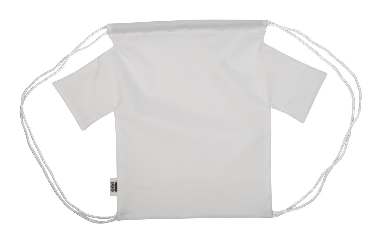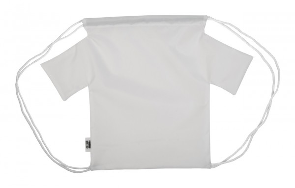 Rucsac cu șnur, în formă de tricou, realizată la comandă, pentru copii, cu șnur colorat, poliester 190T RPET. Cu grafică imprimată prin sublimare și etichetă RPET distinctivă. MOQ: 25 buc.
