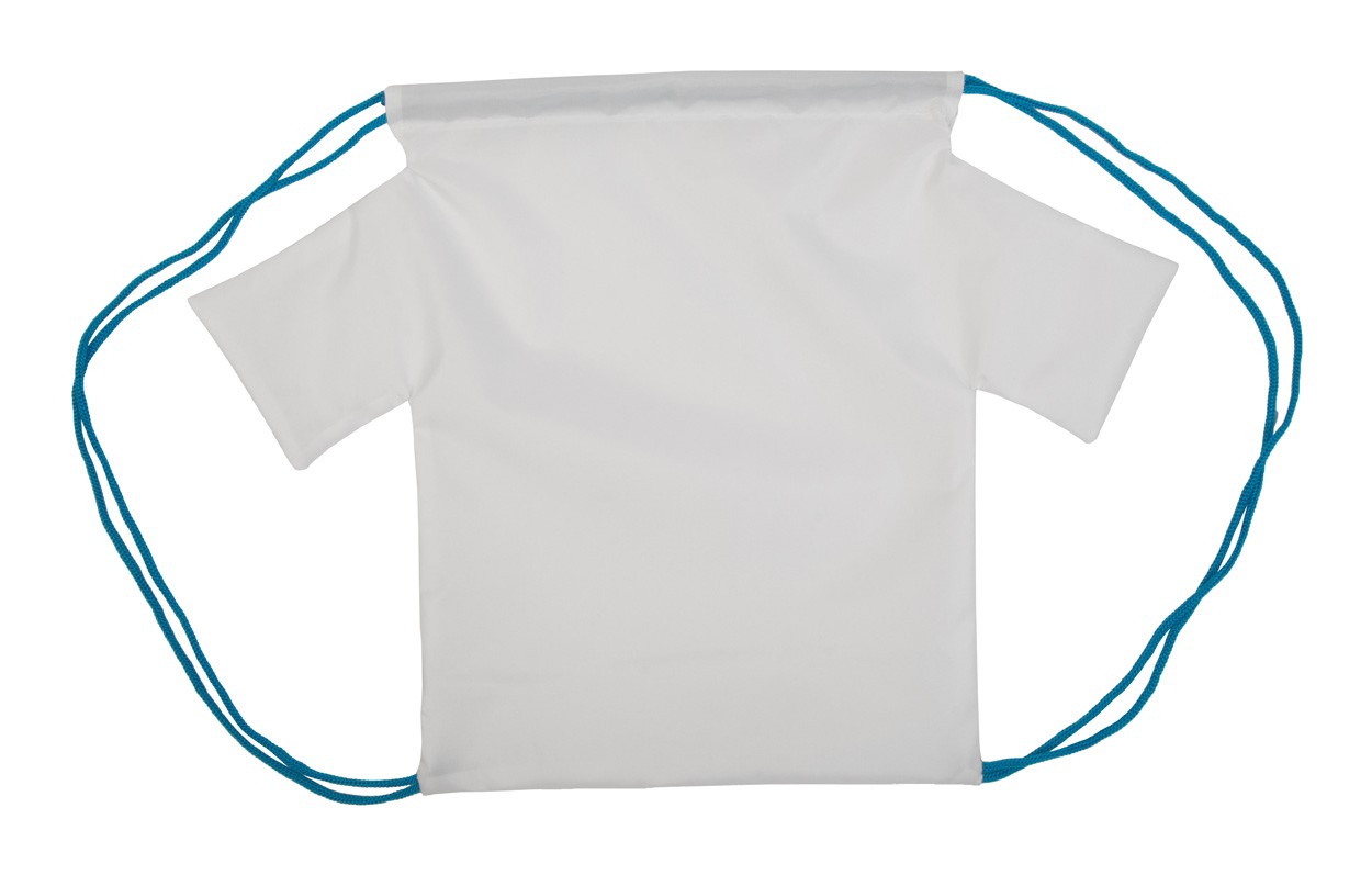 Rucsac cu șnur, în formă de tricou, realizată la comandă, pentru copii, cu șnur colorat, poliester 190T. Cu grafică imprimată prin sublimare. MOQ: 25 buc.