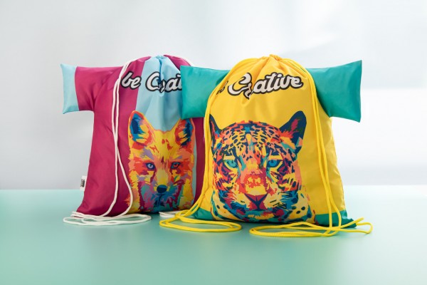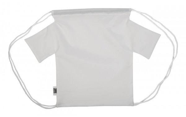 Rucsac personalizat, cu șnur, în formă de tricou, din poliester RPET 190T. Cu grafică imprimată prin sublimare și etichetă RPET distinctivă. MOQ: 25 buc.