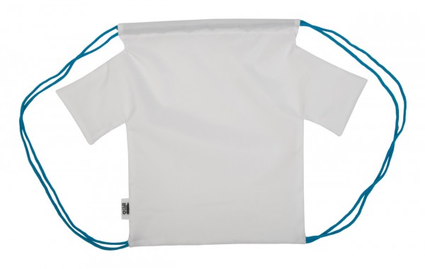 Rucsac personalizat, cu șnur, în formă de tricou, din poliester RPET 190T. Cu grafică imprimată prin sublimare și etichetă RPET distinctivă. MOQ: 25 buc.