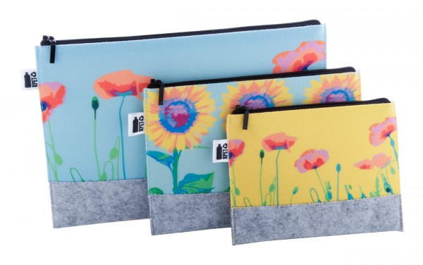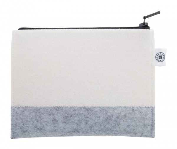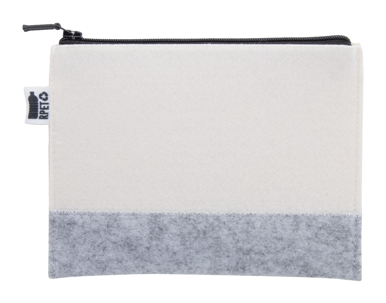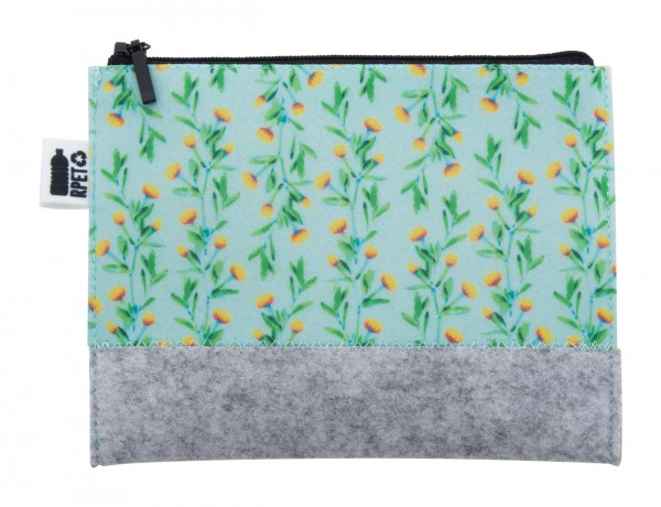 Geantă cosmetică personalizată, cu fermoar, din pâslă RPET, cu grafică imprimată prin sublimare. Cu etichetă distinctivă RPET. MOQ: 50 buc.