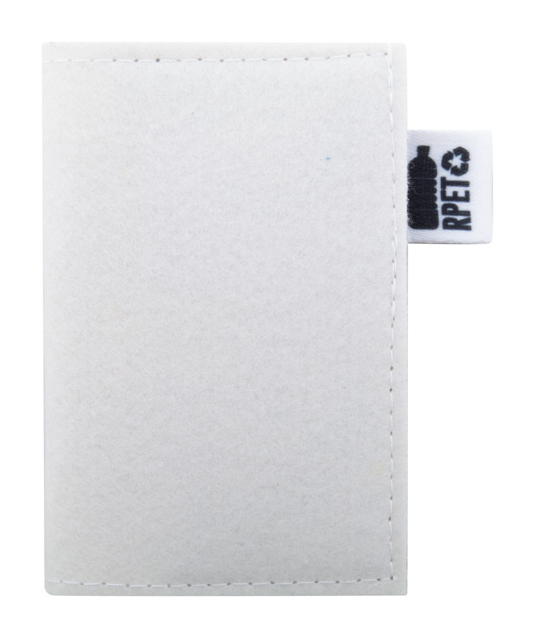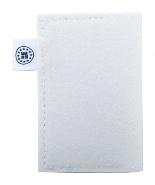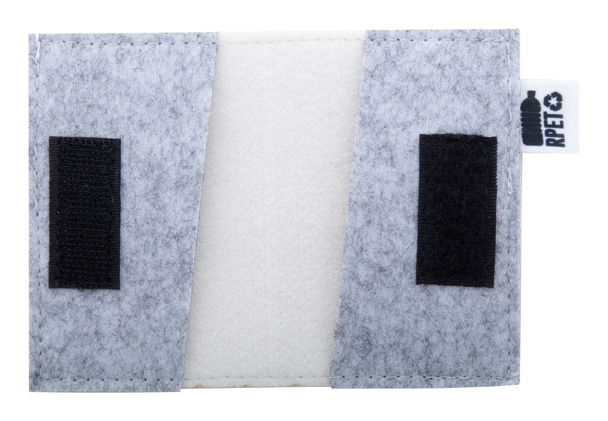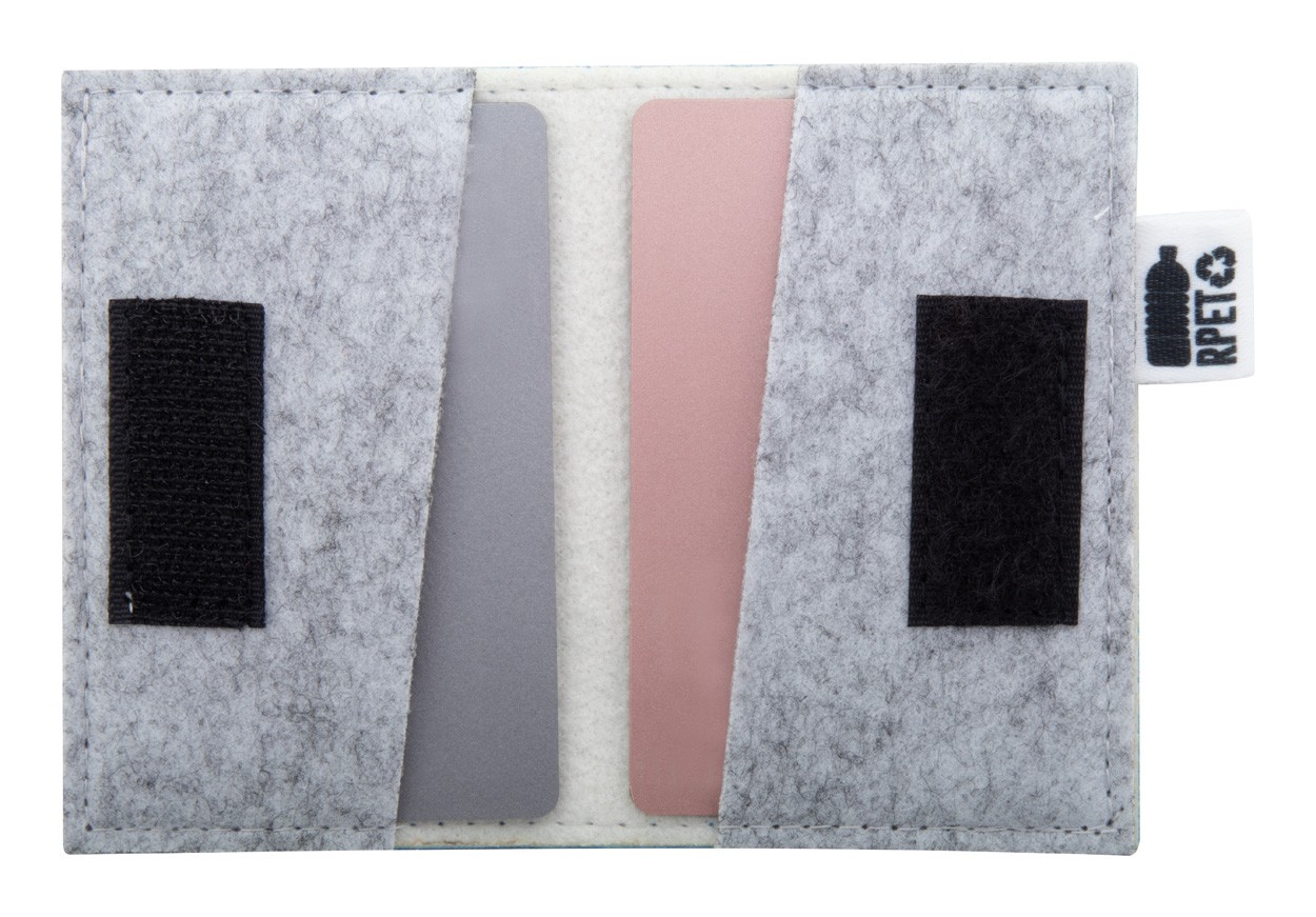 Suport pentru carduri de credit, din fetru RPET, realizat la comandă, cu 2 sloturi pentru card, închidere cu velcro și husă imprimată color. Cu etichetă distinctivă RPET. Prețul include imprimarea prin sublimare. MOQ: 50 buc.