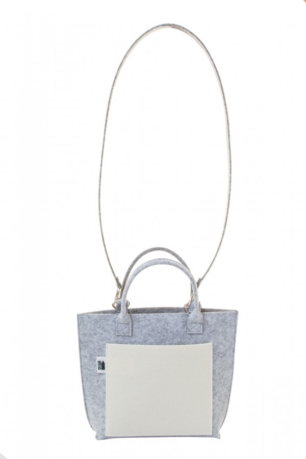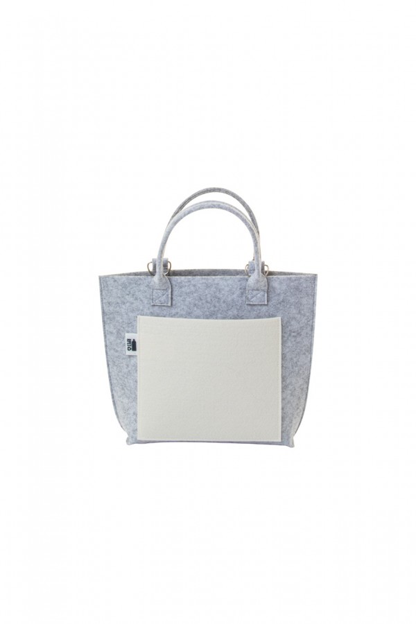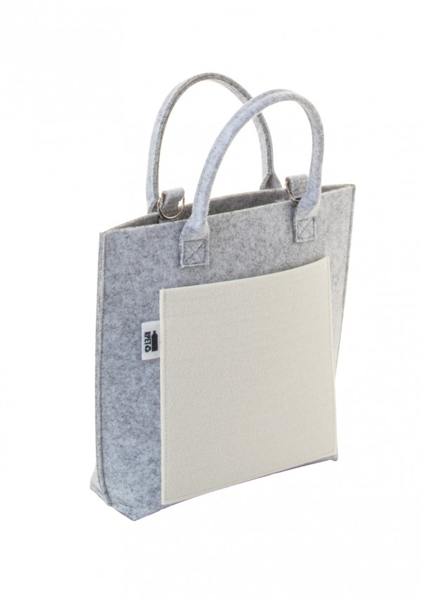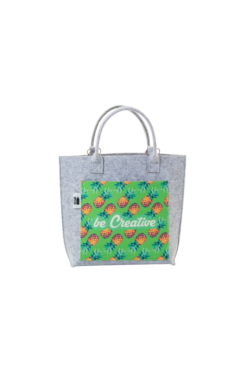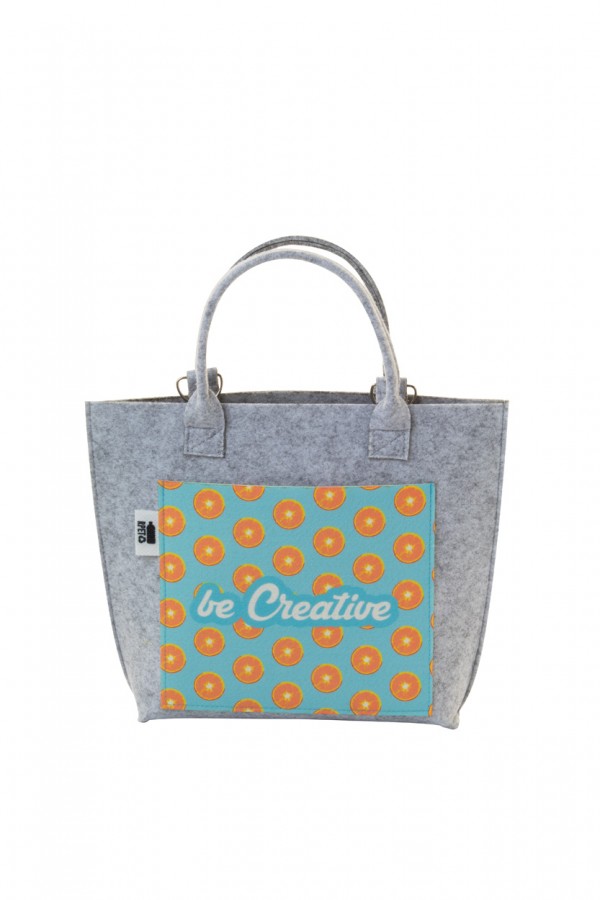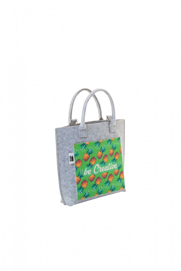 Geantă crossbody pentru femei, realizată la comandă, din fetru RPET, cu buzunar frontal imprimat color. Cu mânere scurte, curea de umăr detașabilă și etichetă distinctivă RPET. Pretul include imprimarea prin sublimare. MOQ: 25 buc.