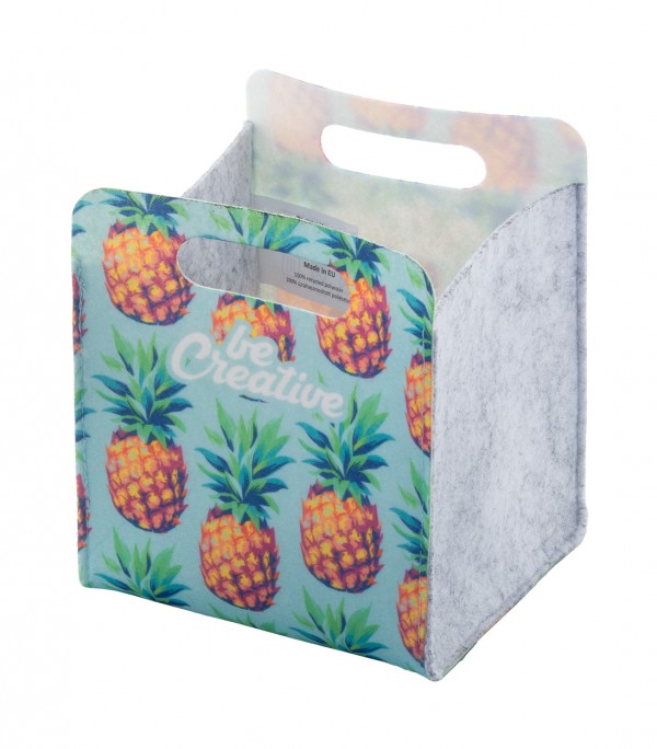 Organizator de birou din pâslă RPET, realizat la comandă, cu grafică imprimată color. Cu mânere tăiate și etichetă distinctivă RPET. Pretul include imprimarea prin sublimare. MOQ: 50 buc.