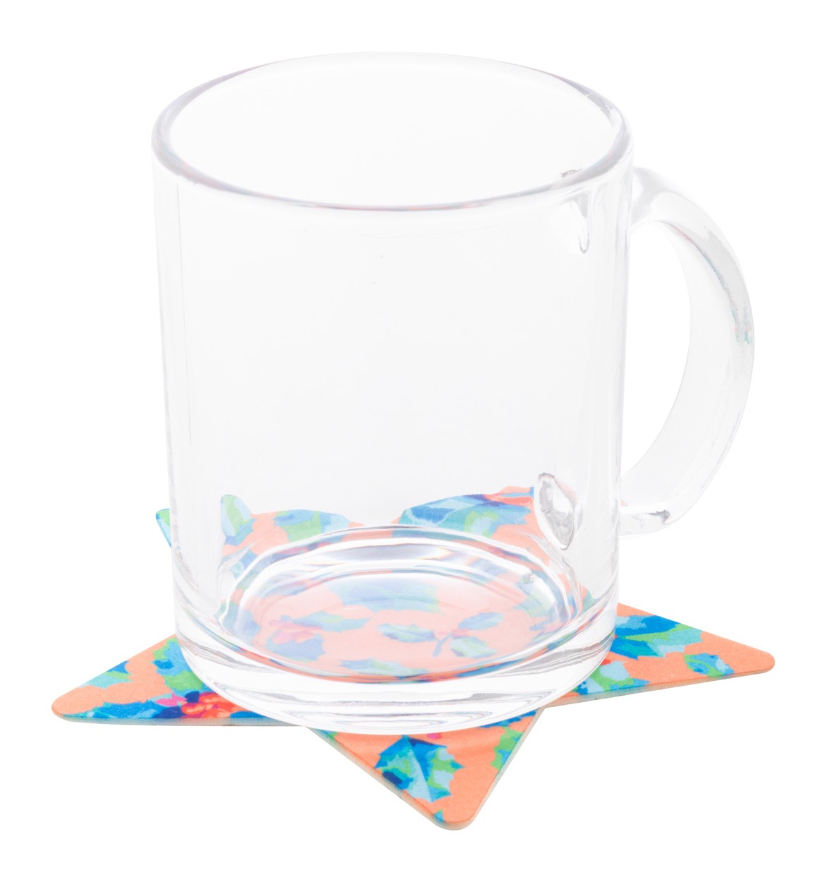 Coaster de Crăciun, din pâslă RPET, realizat la comandă, în formă de stea, cu grafică personalizată pe o parte. Prețul include imprimarea prin sublimare. MOQ: 100 buc.