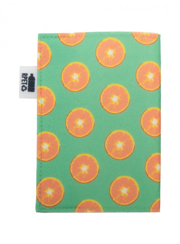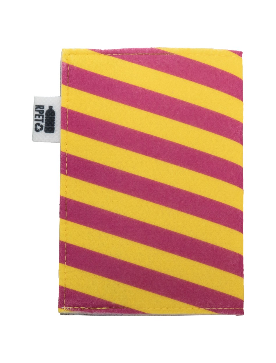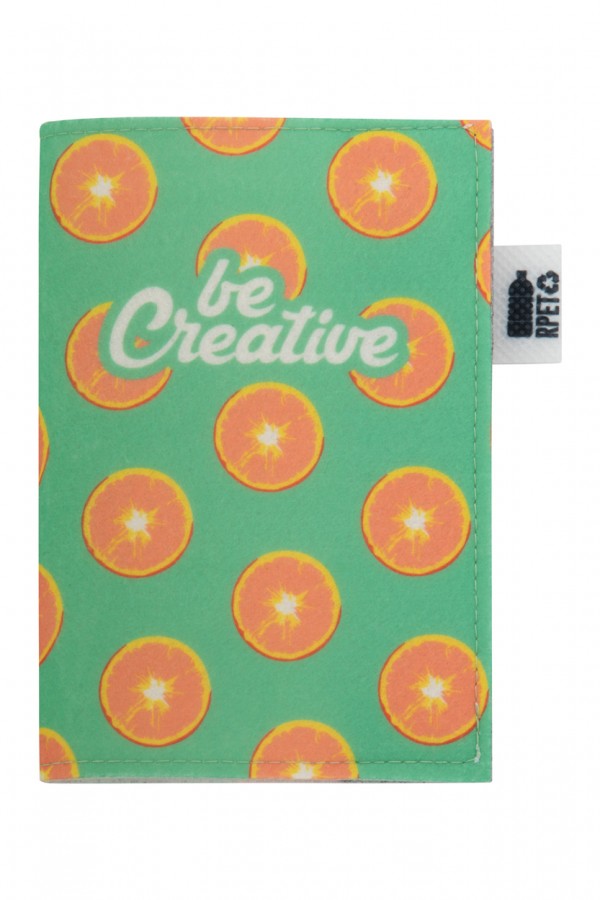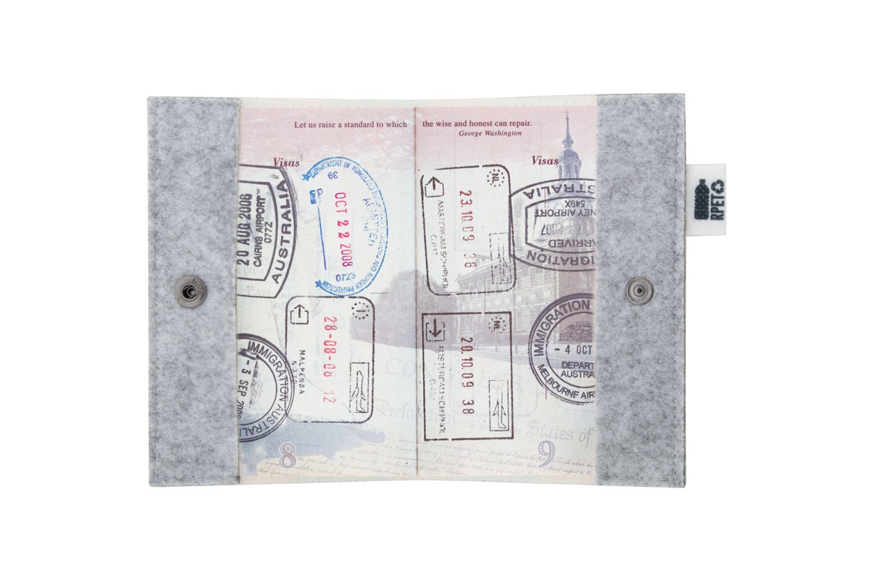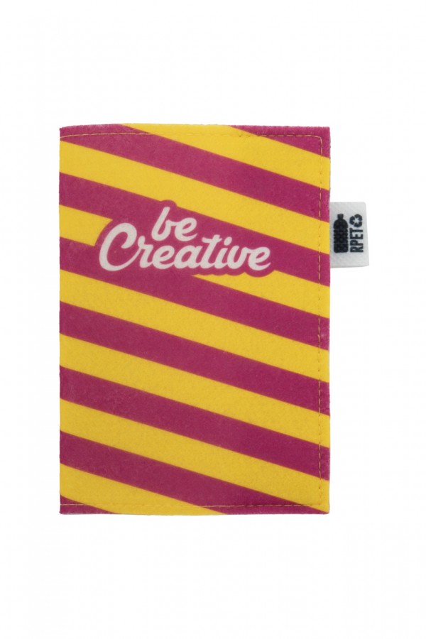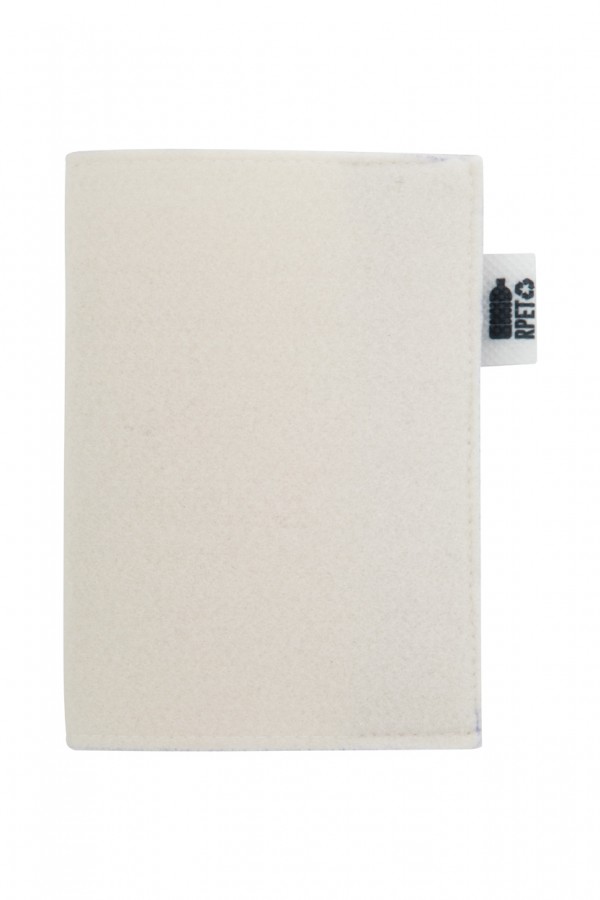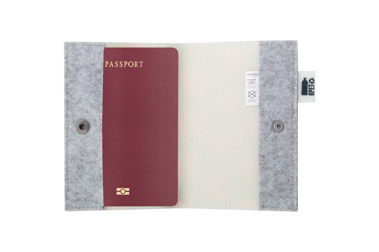 Husă pentru pașaport, din pâslă RPET, realizată la comandă, cu husă imprimată color și închidere cu capsă. Cu etichetă distinctivă RPET. Pretul include imprimarea prin sublimare. MOQ: 50 buc.