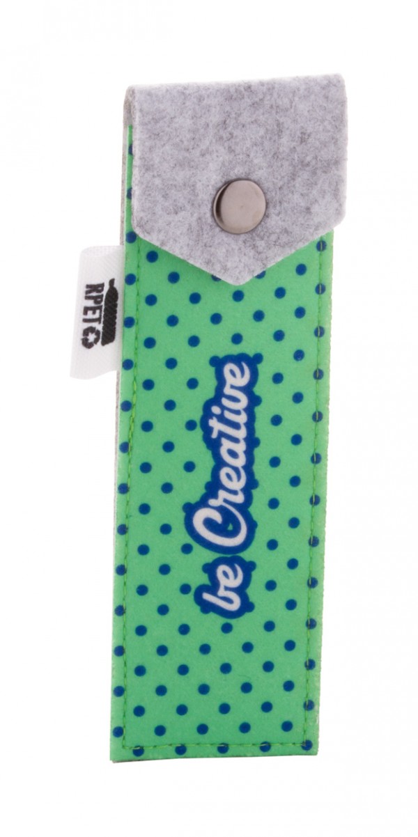 Husă pentru pixuri, RPET, realizată la comandă, cu partea frontală imprimată color, cu închidere prin capsă. Cu etichetă distinctivă RPET. Pretul include imprimarea prin sublimare. MOQ: 50 buc.