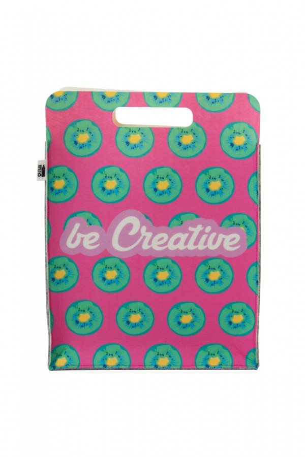 Geantă de cumpărături, realizată la comandă, din fetru RPET, imprimată în fa?ă ?i în spate. Cu mânere tăiate, gu?on ?i etichetă distinctivă RPET. Pretul include imprimarea prin sublimare. MOQ: 25 buc.