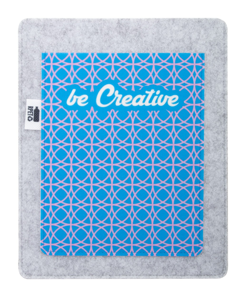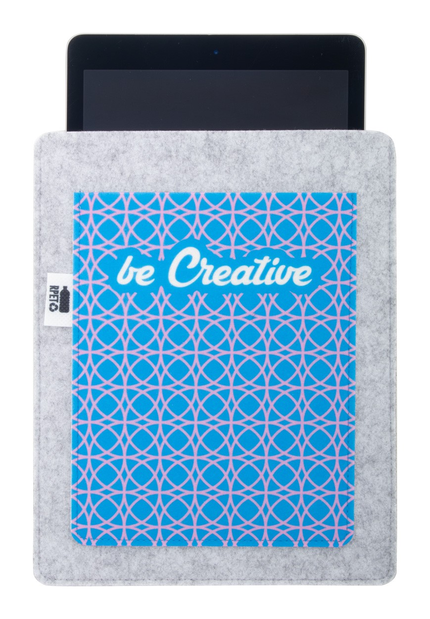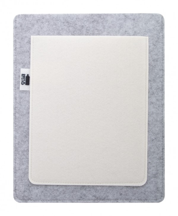 Suport pentru tabletă, din pâslă RPET, realizat la comandă, cu buzunar frontal imprimat color. Cu etichetă distinctivă RPET. Se potrivește tabletelor de până la 11". Prețul include imprimarea prin sublimare. MOQ: 25 buc.