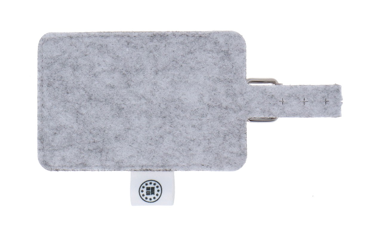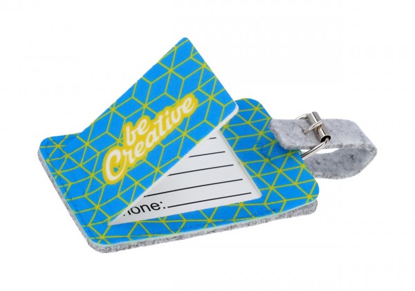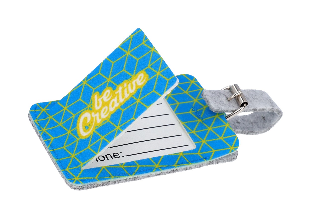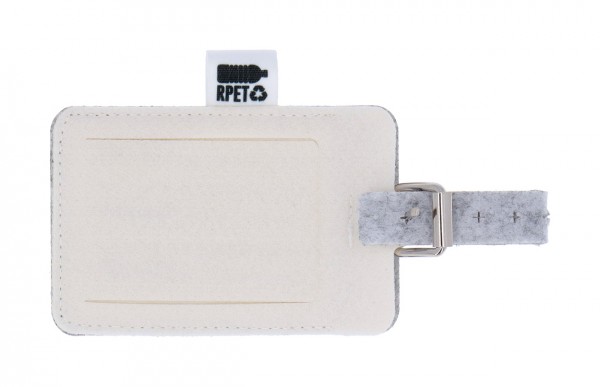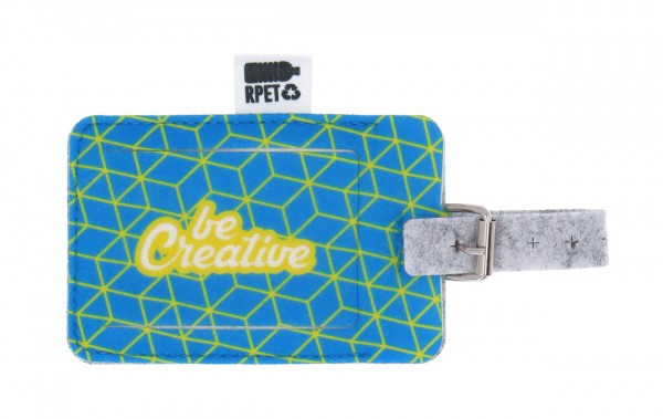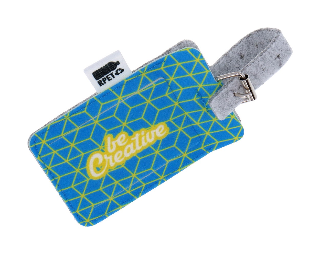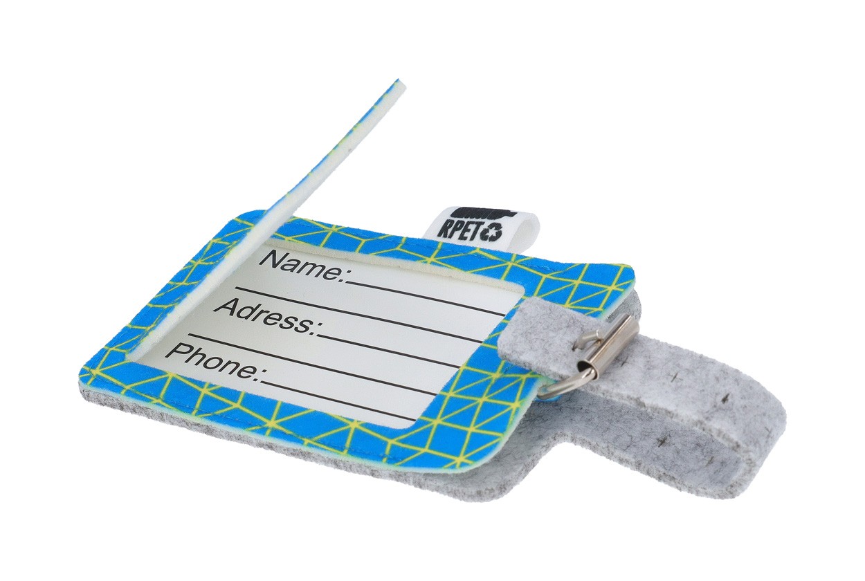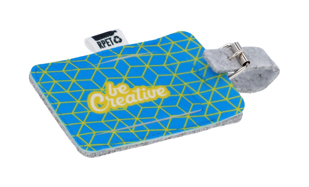 Etichetă de bagaj, din pâslă RPET, realizată la comandă, cu partea frontală imprimată color, închidere cu cataramă și inserție de hârtie. Cu etichetă distinctivă RPET. Pretul include imprimarea prin sublimare. MOQ: 50 buc.