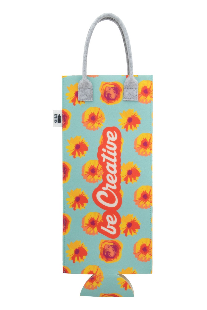 Pungă cadou pentru sticlă de vin, produsă la comandă, din fetru RPET, cu grafică imprimată color. Cu etichetă distinctivă RPET. Pretul include imprimarea prin sublimare. MOQ: 25 buc.
