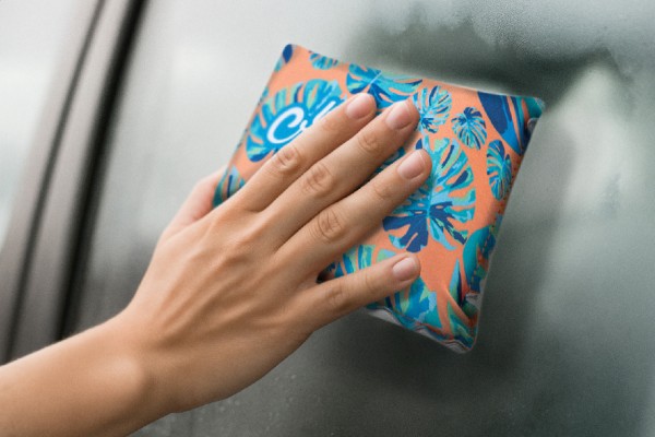 Burete anti-aburire pentru parbriz auto, realizat la comandă, acoperit cu microfibră RPET și piele sintetică absorbantă. Cu grafică imprimată prin sublimare pe partea frontală. MOQ: 50 buc.