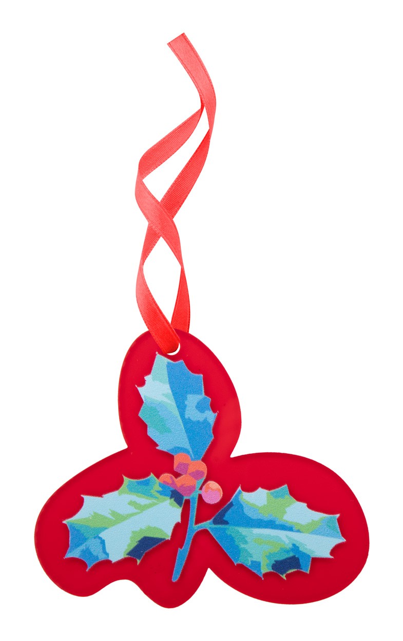 Ornament pentru brad de Crăciun, realizat la comandă din acril, cu formă personalizată și grafică plină de culoare. Dimensiune maximă: 80x80 mm. Pretul include imprimarea UV LED pe o parte. Livrat cu panglică detașată. MOQ: 100 buc.