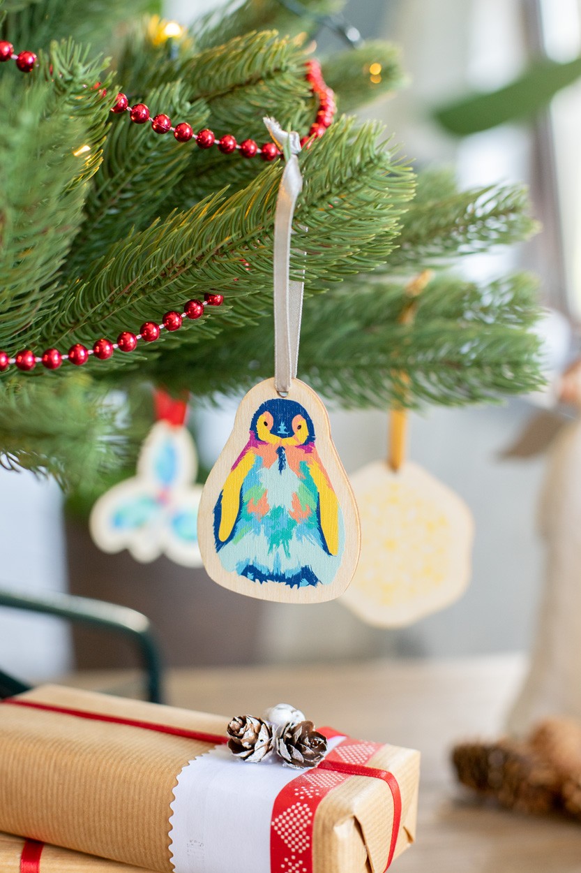 Ornament pentru brad de Crăciun, realizat la comandă din placaj de mesteacăn, cu formă personalizată și grafică plină de culoare. Dimensiune maxima: 80x80 mm. Pretul include imprimarea UV LED pe o parte. Livrat cu panglică detașată. MOQ: 100 buc.