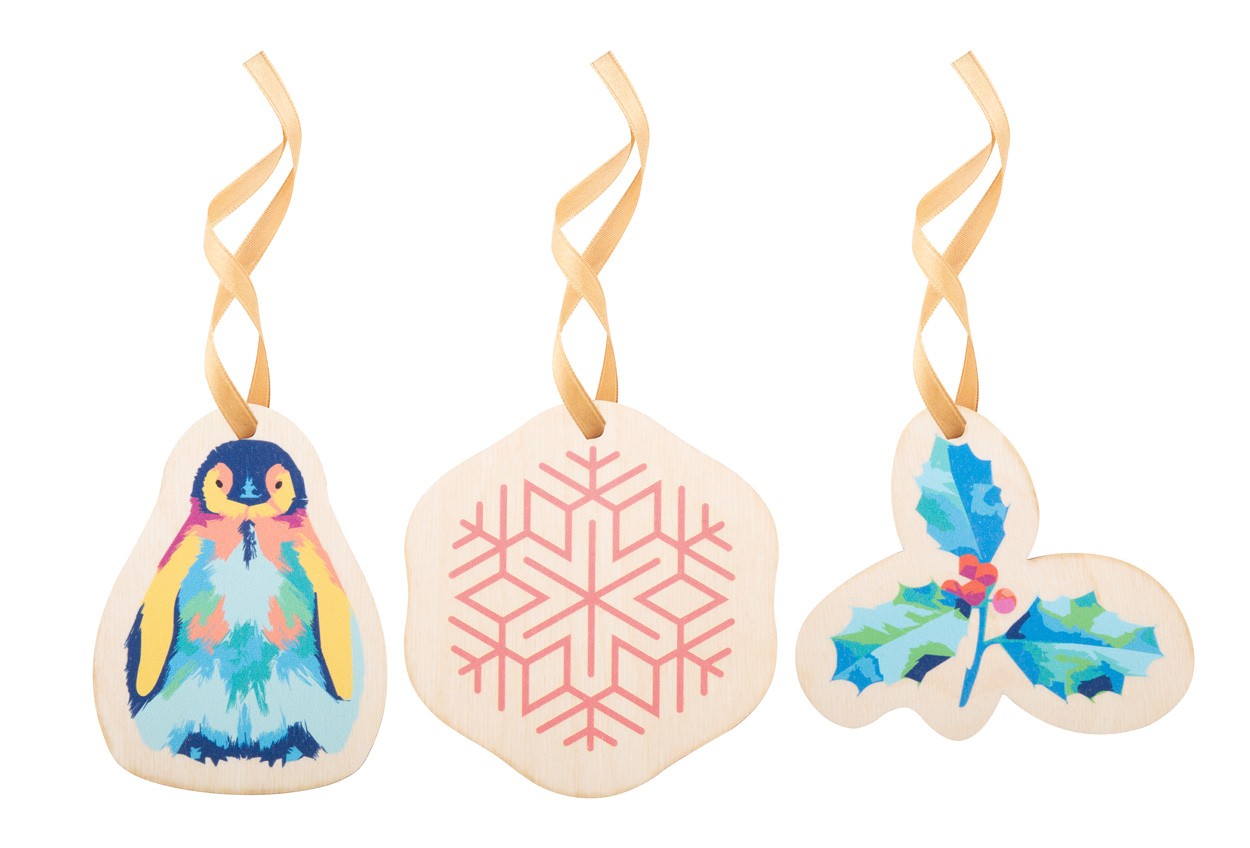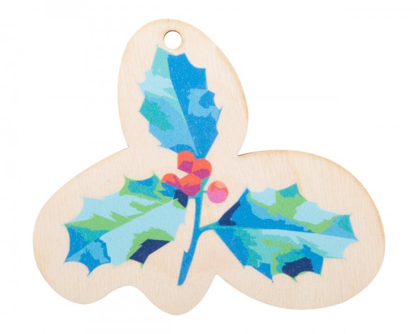 Ornament pentru brad de Crăciun, realizat la comandă din placaj de mesteacăn, cu formă personalizată și grafică plină de culoare. Dimensiune maxima: 80x80 mm. Pretul include imprimarea UV LED pe o parte. Livrat cu panglică detașată. MOQ: 100 buc.