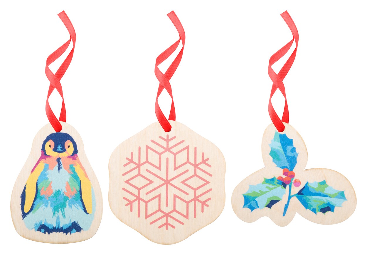 Ornament pentru brad de Crăciun, realizat la comandă din placaj de mesteacăn, cu formă personalizată și grafică plină de culoare. Dimensiune maxima: 80x80 mm. Pretul include imprimarea UV LED pe o parte. Livrat cu panglică detașată. MOQ: 100 buc.