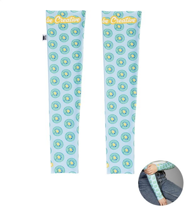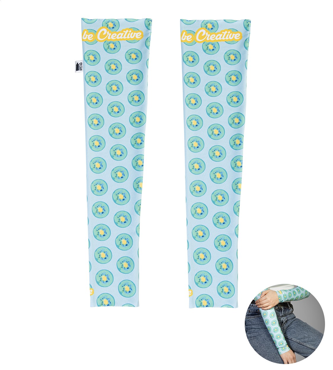O pereche de manșete elastice, RPET, personalizate, cu imprimeu sublimat pe toată suprafața. 92% poliester RPET și 8% elastan (185 g/m²), cu etichetă RPET distinctivă. Cantitate minimă de comandă: 50 buc. Mărimi: M (8×12×48 cm), L (9,5×13,5×52 cm).