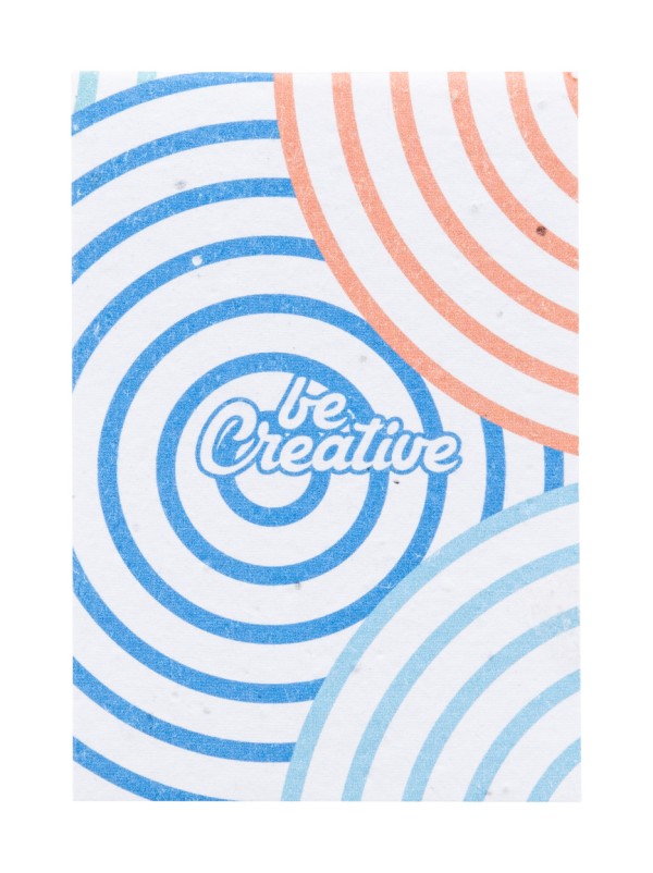 Mini caiet personalizat, acoperit cu hârtie de semințe, cu 32 de coli de hârtie reciclată, format A7. Prețul include copertă exterioară imprimată color. MOQ: 100 buc. Cu semințe de flori sălbatice asortate.