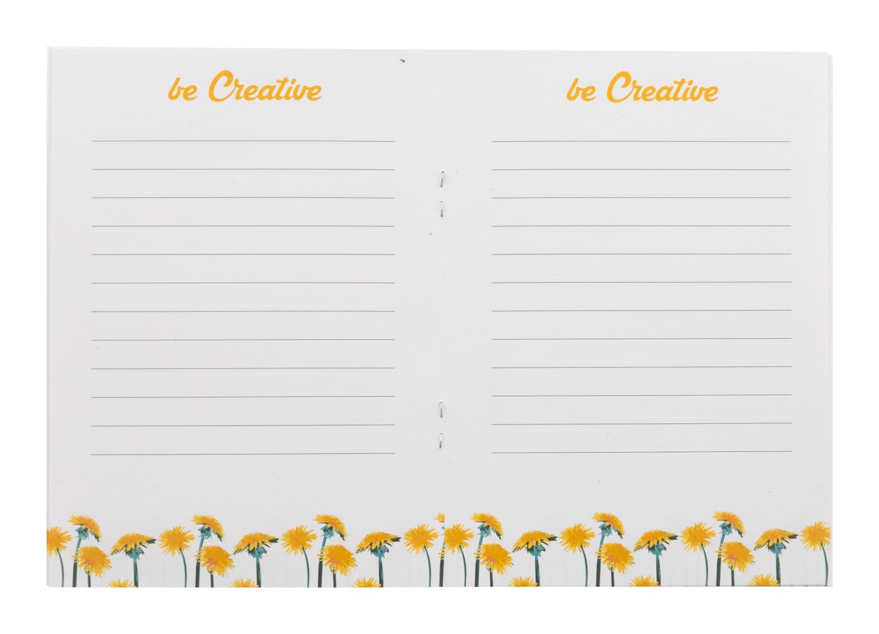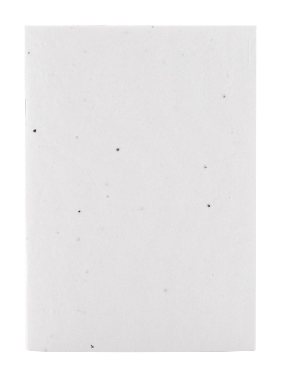 Caiet personalizat, acoperit cu hârtie de semințe, cu 32 de coli de hârtie reciclată, format A6. Prețul include coperta exterioară imprimată color și o imprimare color identică pe toate paginile interioare. MOQ: 100 buc. Cu semințe de flori sălbatice asortate.