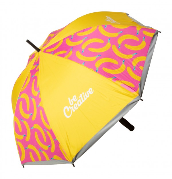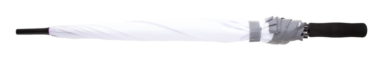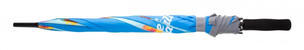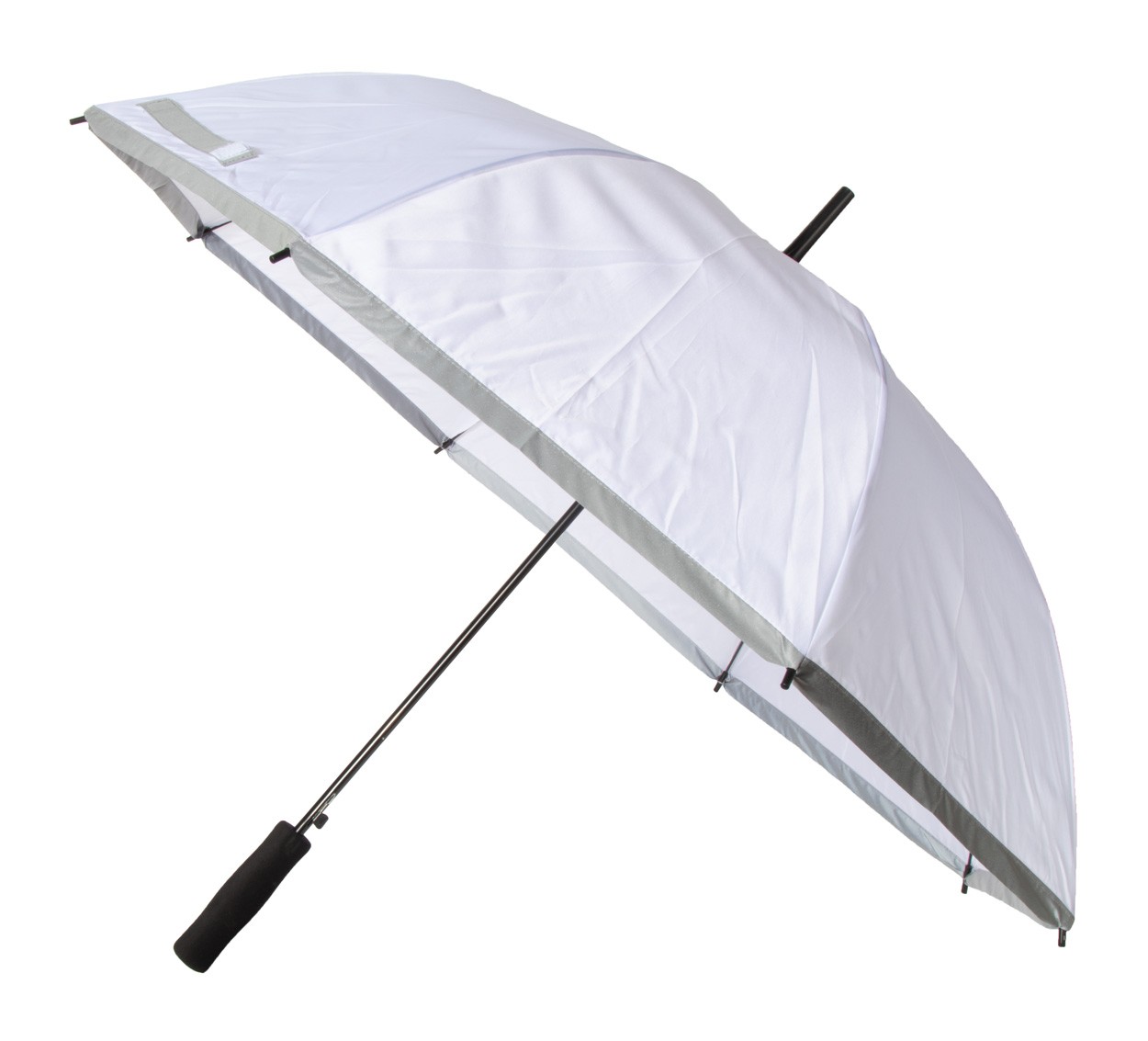 Umbrelă automată, realizată la comandă, cu 8 panouri, cu ornamente reflectorizante, ax metalic, nervuri din fibră de sticlă și mâner EVA. Pongee 190T RPET. Cu etichetă RPET distinctivă și grafică imprimată prin sublimare pe toate panourile. MOQ: 50 buc. Numai pentru uz promoțional, produsul nu se califică drept Echipament de protecție personală.
