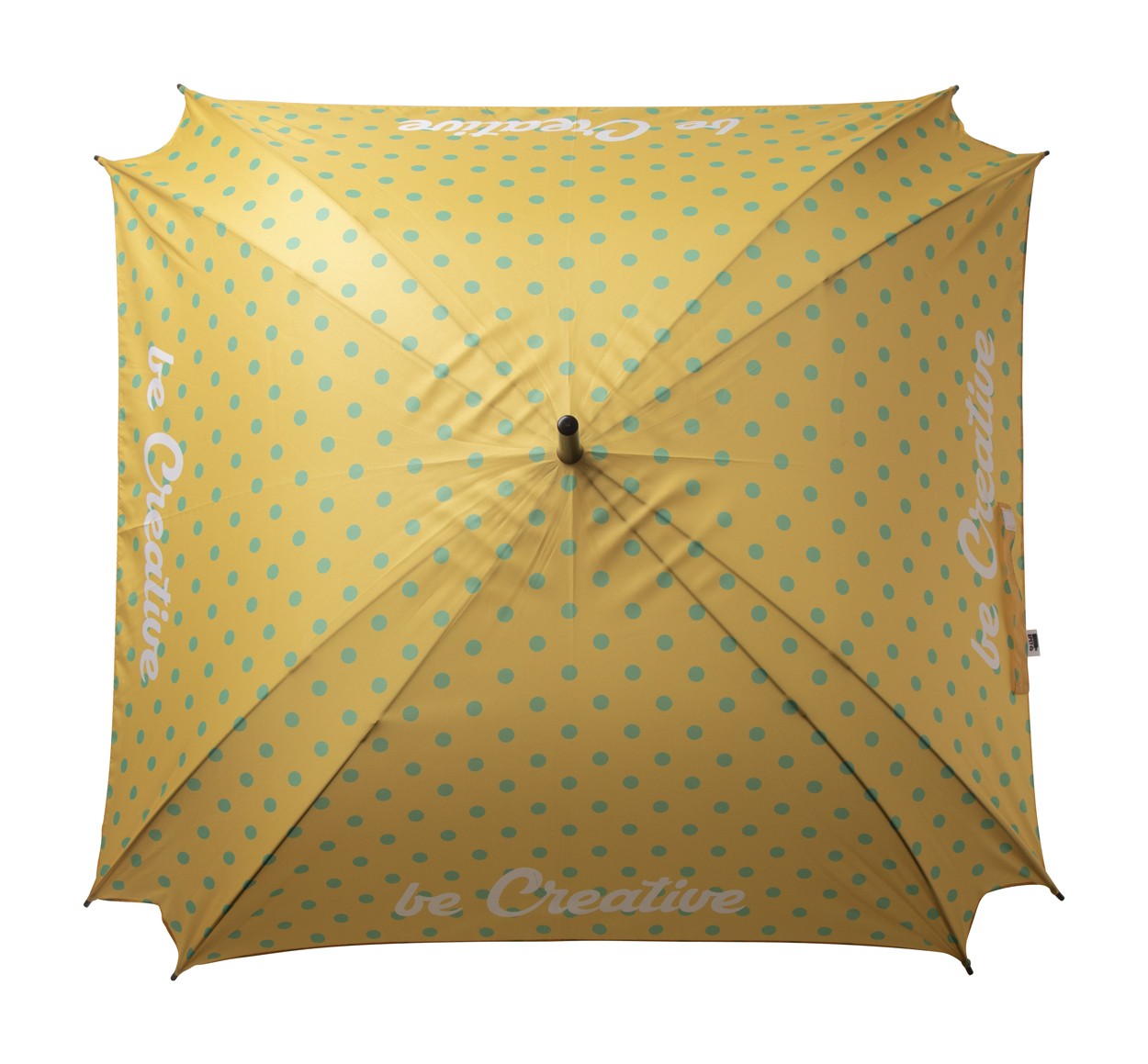 Umbrela automata patrata personalizata cu sublimare, cu ax metalic, spite din fibra de sticla si maner din lemn. Pongee 190T RPET. pongee. Cu etichetă distinctă RPET. Cantitate minima de comanda 50 buc.