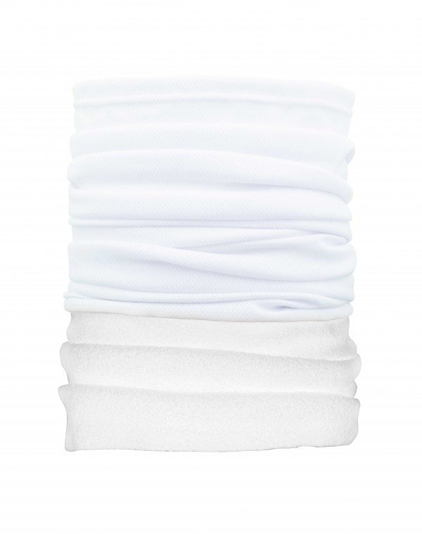 Eșarfă multifuncțională personalizată, din poliester respirabil și cu uscare rapidă, cu încălzitor de gât din polar colorat. Cu grafică imprimată pe toată suprafața pe partea din poliester. Fabricat din țesături 100% poliester (135 g / m²) și lână polară (160 g / m²). MOQ: 100 buc.