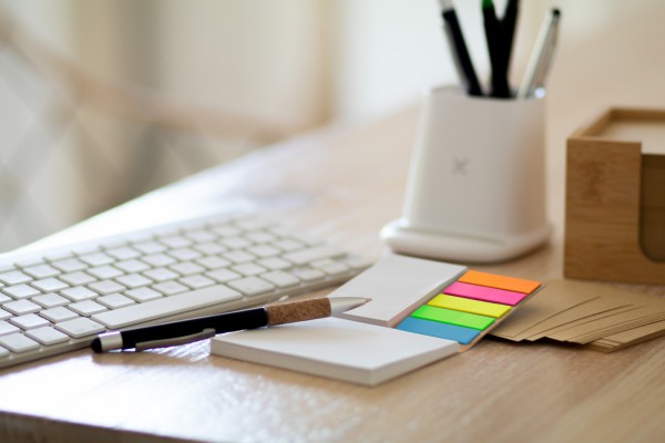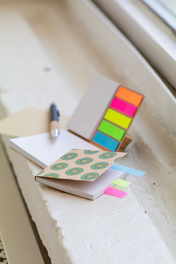 Carnețel de note adezive, personalizat, reciclat, acoperit cu hârtie kraft. Include note adezive din hârtie reciclată în 2 dimensiuni (50 de coli de 100x75 mm, 25 de coli de 50x75 mm) și 100 de marcatori de pagini din folie de plastic în 5 culori asortate (44x12 mm). Prețul include coperta exterior imprimată color. MOQ: 100 buc.