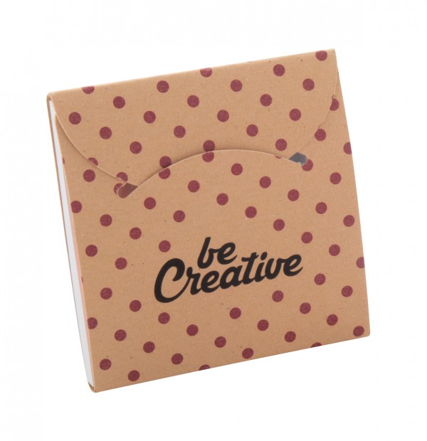 Carnețel de note adezive, realizat la comandă, reciclat, acoperit cu hârtie kraft. Include 50 de note adezive din hârtie reciclată (75x75 mm) și 100 de markere de pagină din folie de plastic în 5 culori asortate (44x12 mm). Prețul include coperta exterior imprimată color. MOQ: 100 buc.