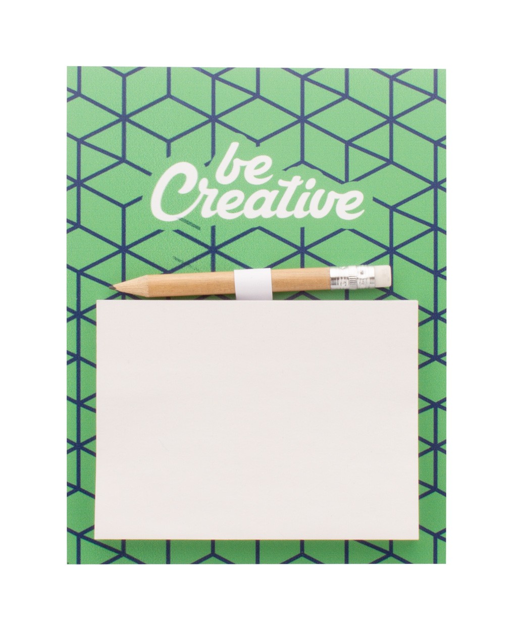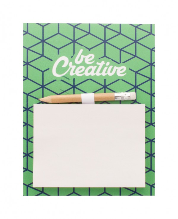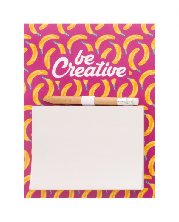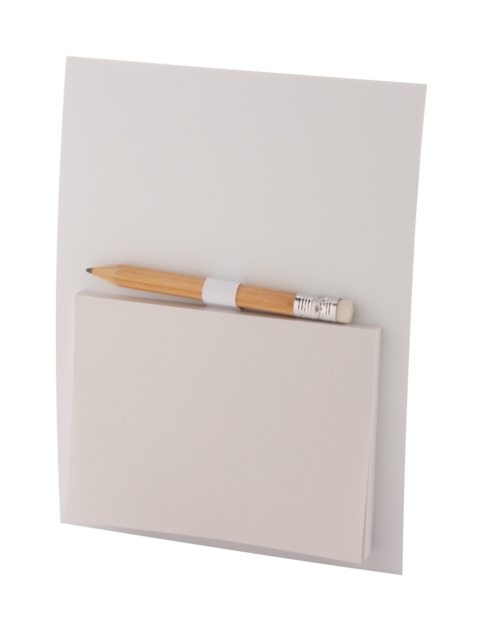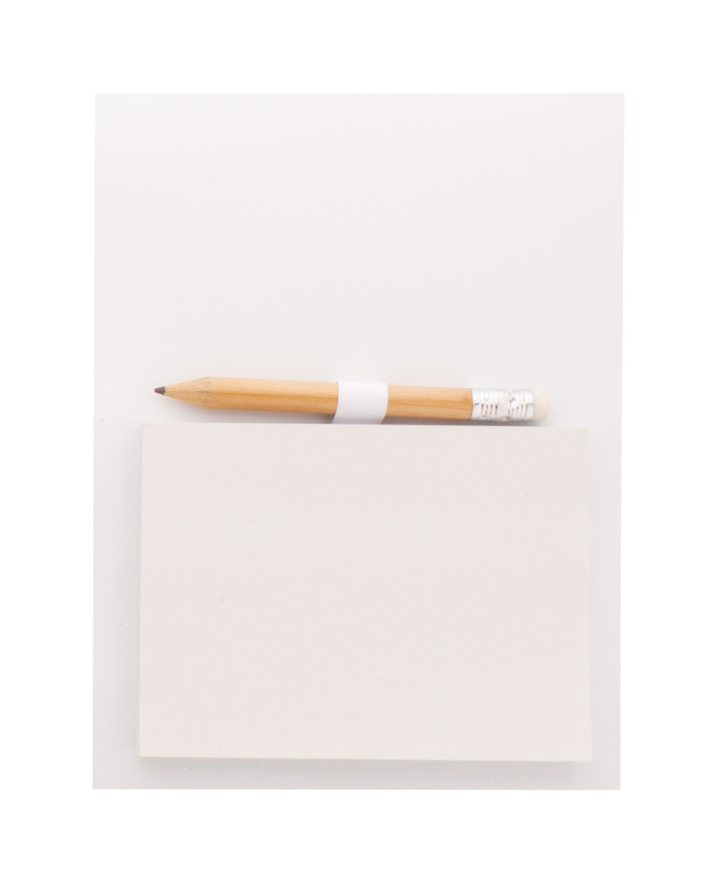 Magnet de frigider, personalizat, cu bloc de note adezive și mini creion din lemn. Include 50 de coli de hârtie reciclată, (100×75 mm). MOQ: 100 buc.