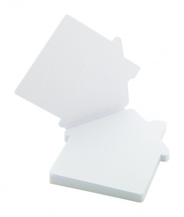 Bloc de note adezive, în formă de casă, realizat la comandă, acoperit cu hârtie. Include 50 de coli din hârtie reciclată. Pretul include coperta exterior imprimată color. MOQ: 100 buc.
