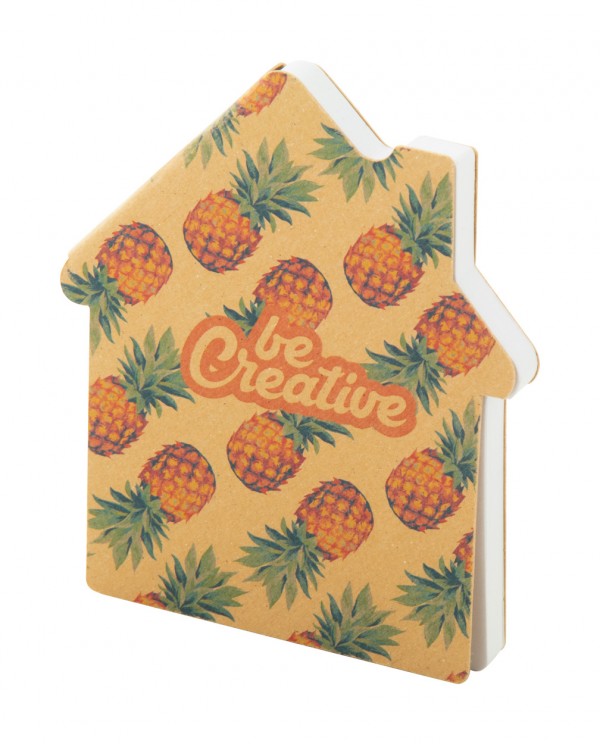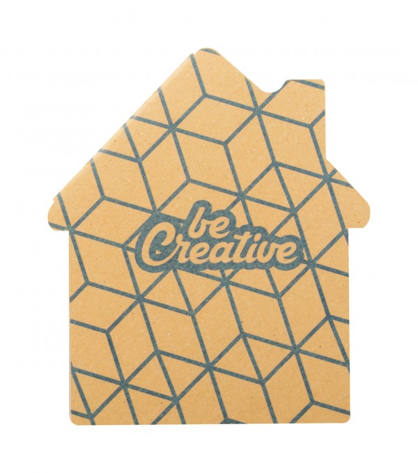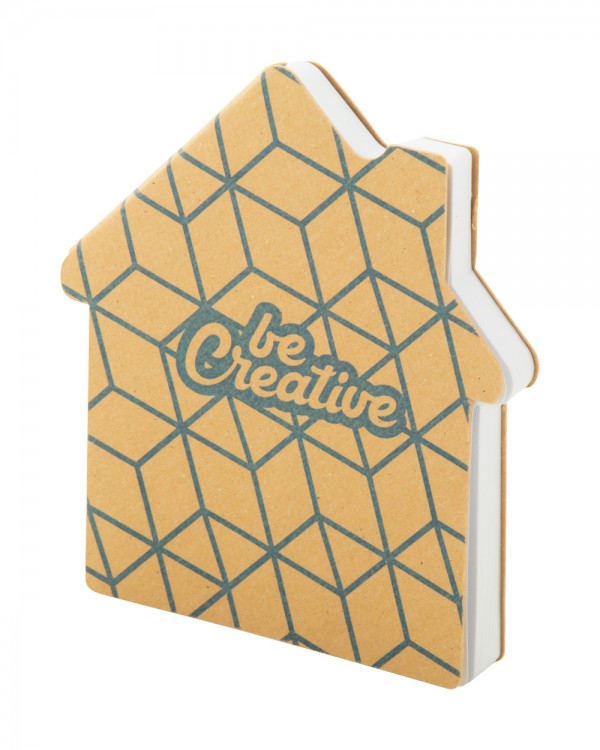 Bloc de note adezive, în formă de casă, realizat la comandă, acoperit cu hârtie kraft reciclată. Include 50 de coli din hârtie reciclată. Pretul include coperta exterior imprimată color. MOQ: 100 buc.