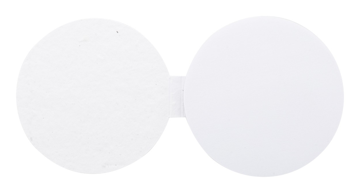 Blocnotes cu note adezive, realizat la comandă, acoperit cu hârtie cu semințe, în formă rotundă. Include 50 de note adezive din hârtie reciclată. Prețul include coperta exterior imprimată color. MOQ: 100 buc. Cu semințe de flori sălbatice.