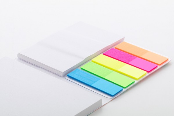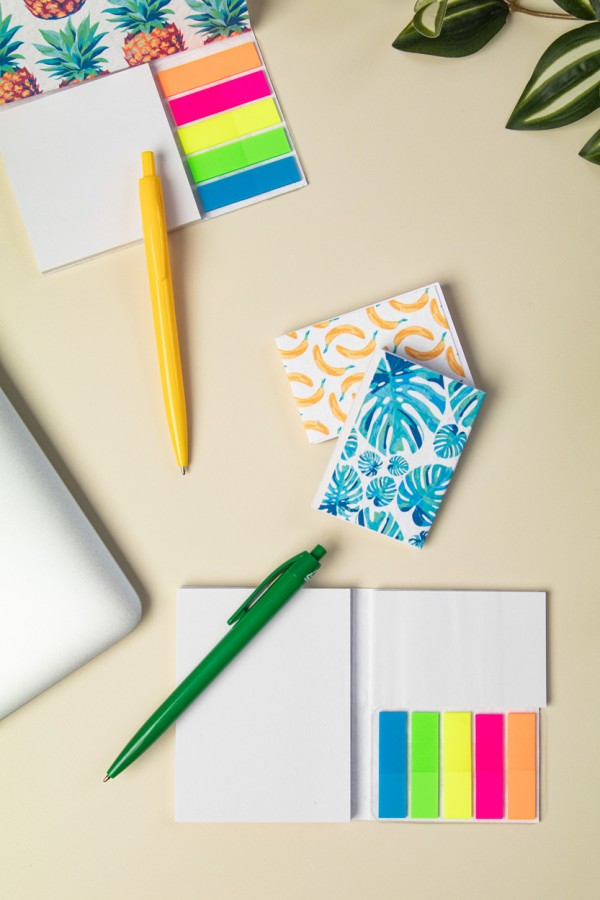 Blocnotes cu note adezive, realizat la comandă, acoperit cu hârtie de semințe. Include note adezive din hârtie reciclată în 2 dimensiuni (50 de coli de 100×75 mm, 25 de coli de 50×75 mm) și 100 de markere pentru pagini din folie de plastic în 5 culori asortate (12×44 mm). Prețul include coperta exterior imprimată color. MOQ: 100 buc. Cu semințe de flori sălbatice.
