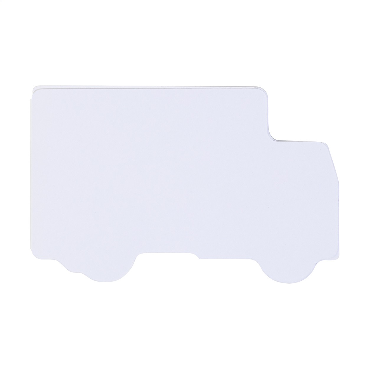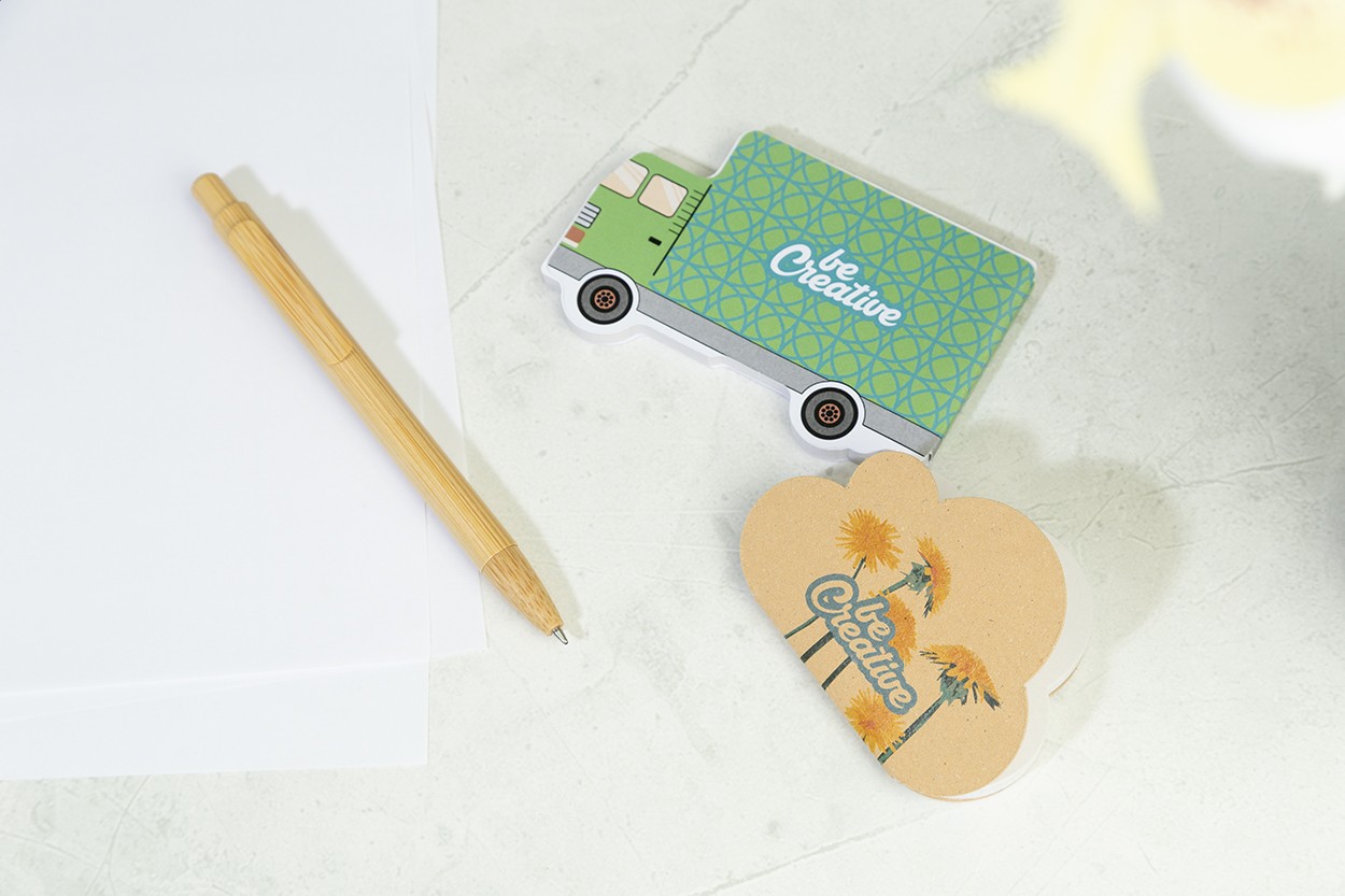 Carnet adeziv personalizat, în formă de camion, acoperit cu hârtie. Include 50 de foi de hârtie reciclată adezivă. Prețul include coperta exterioară imprimată full color. Cantitate minimă de comandă: 100 bucăți.