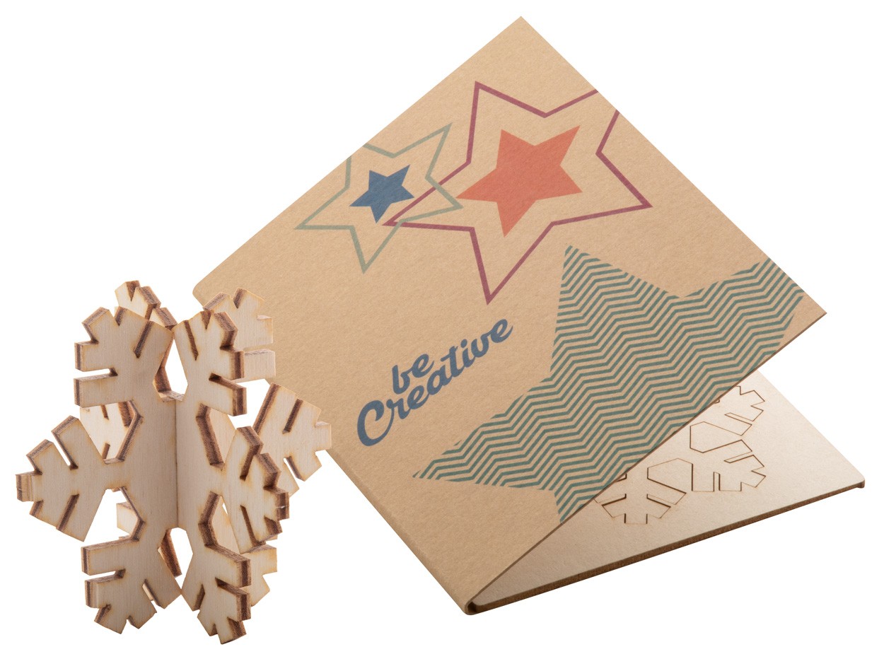 Felicitare de Craciun din hartie kraft si placa din fibra de lemn, cu personalizare pe ambele fete, cu ornament puzzle de Craciun. Plic C6 inclus. Cantitate minima de comanda 100 buc.