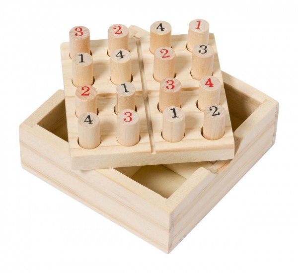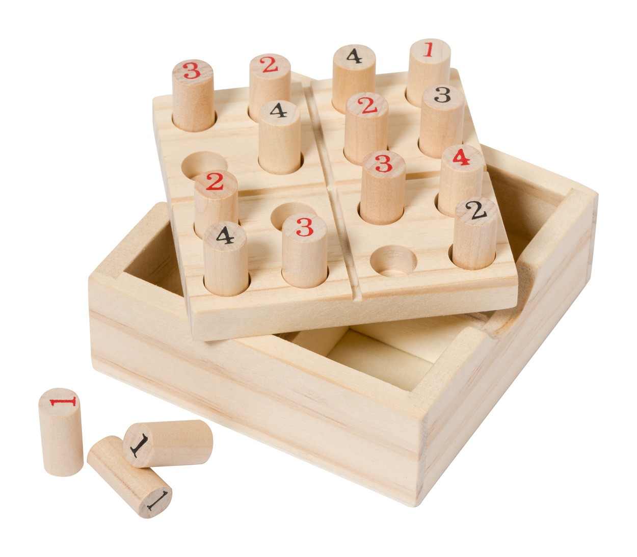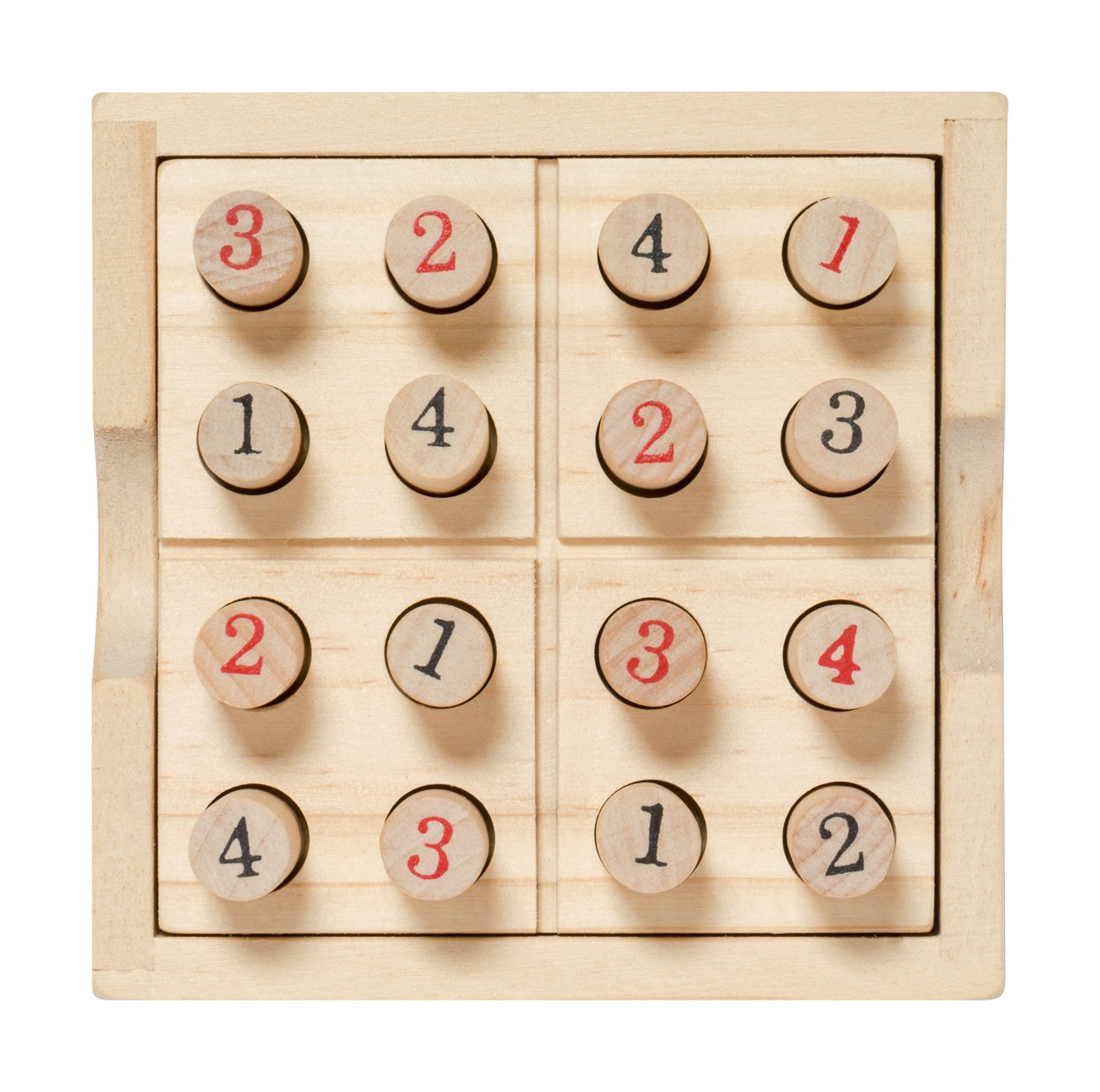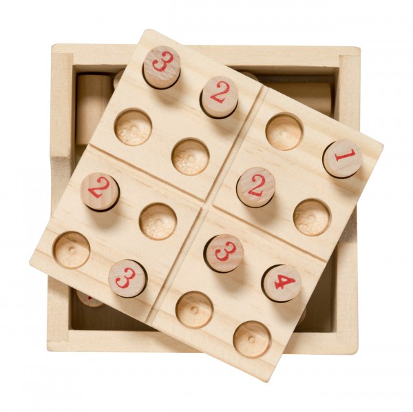 Joc de îndemânare sudoku, din lemn, cu 16 spații numerotate.