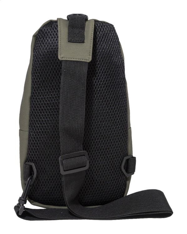 Geantă crossbody impermeabilă, din RPET, cu buzunare cu fermoar, închidere cu cataramă și spate căptușit. Cu curea de umăr reglabilă, cu poziții laterale stânga și dreapta. Poliester RPET 600D acoperit cu PU, cu etichetă distinctivă RPET.