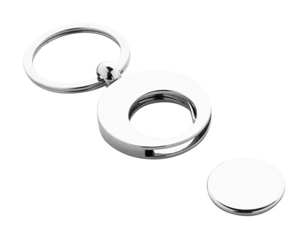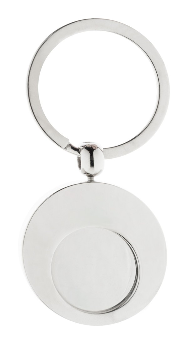 Breloc metalic, de formă rotundă, cu monedă cărucior pentru cumpărături. În cutie de hârtie kraft.
