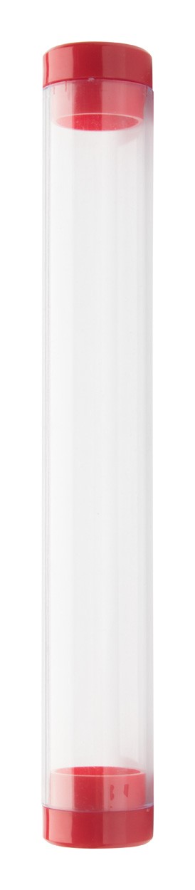 Etui din plastic transparent pentru pix, cu capace colorate.