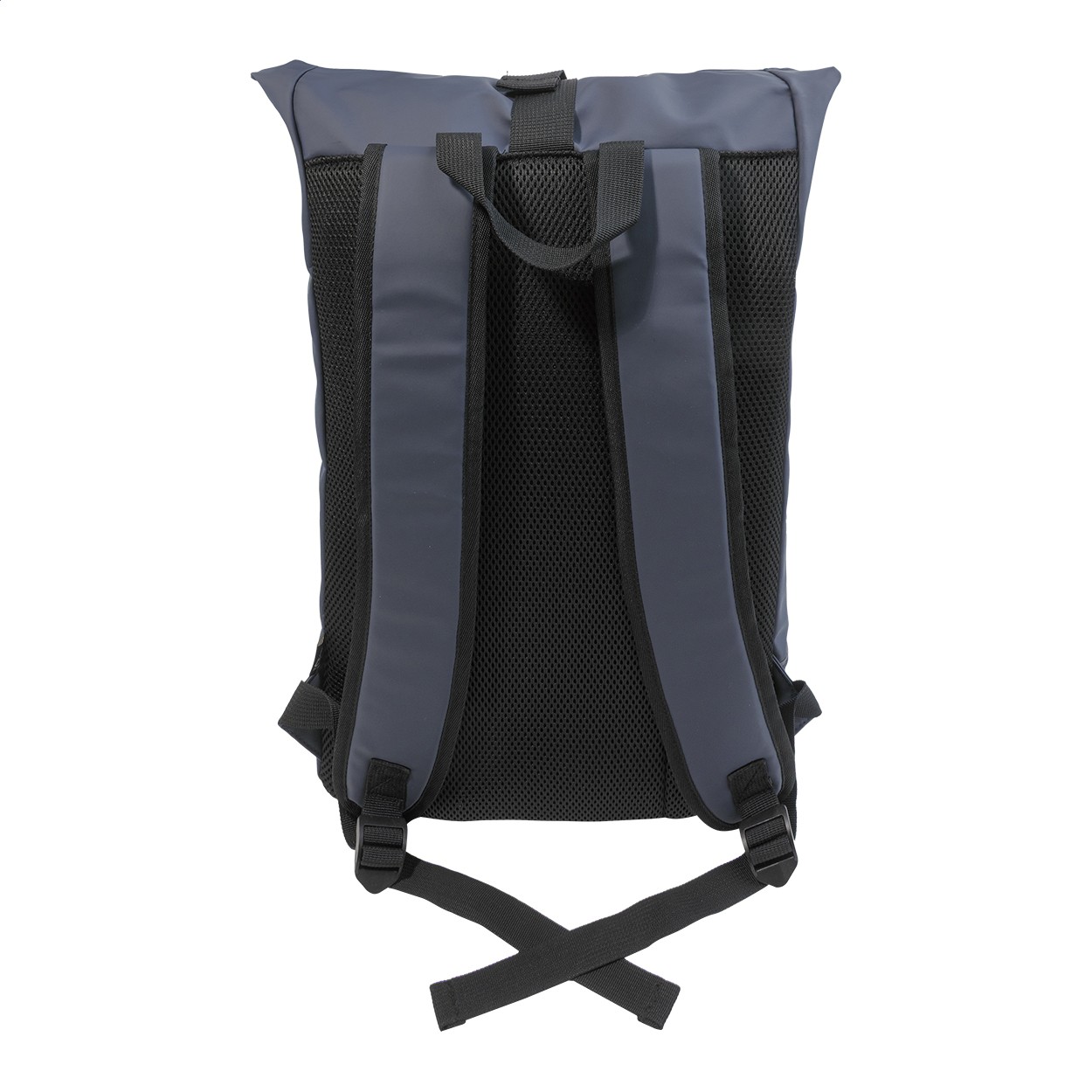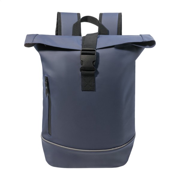 Rucsac impermeabil, moale, din piele PU reciclată, cu compartiment principal cu fermoar și închidere cu cataramă, buzunar frontal cu fermoar impermeabil, compartiment căptușit pentru laptop (15") și bandă reflectorizantă. Cu spate și bretele căptușite. Cu etichetă distinctivă din PU reciclat.