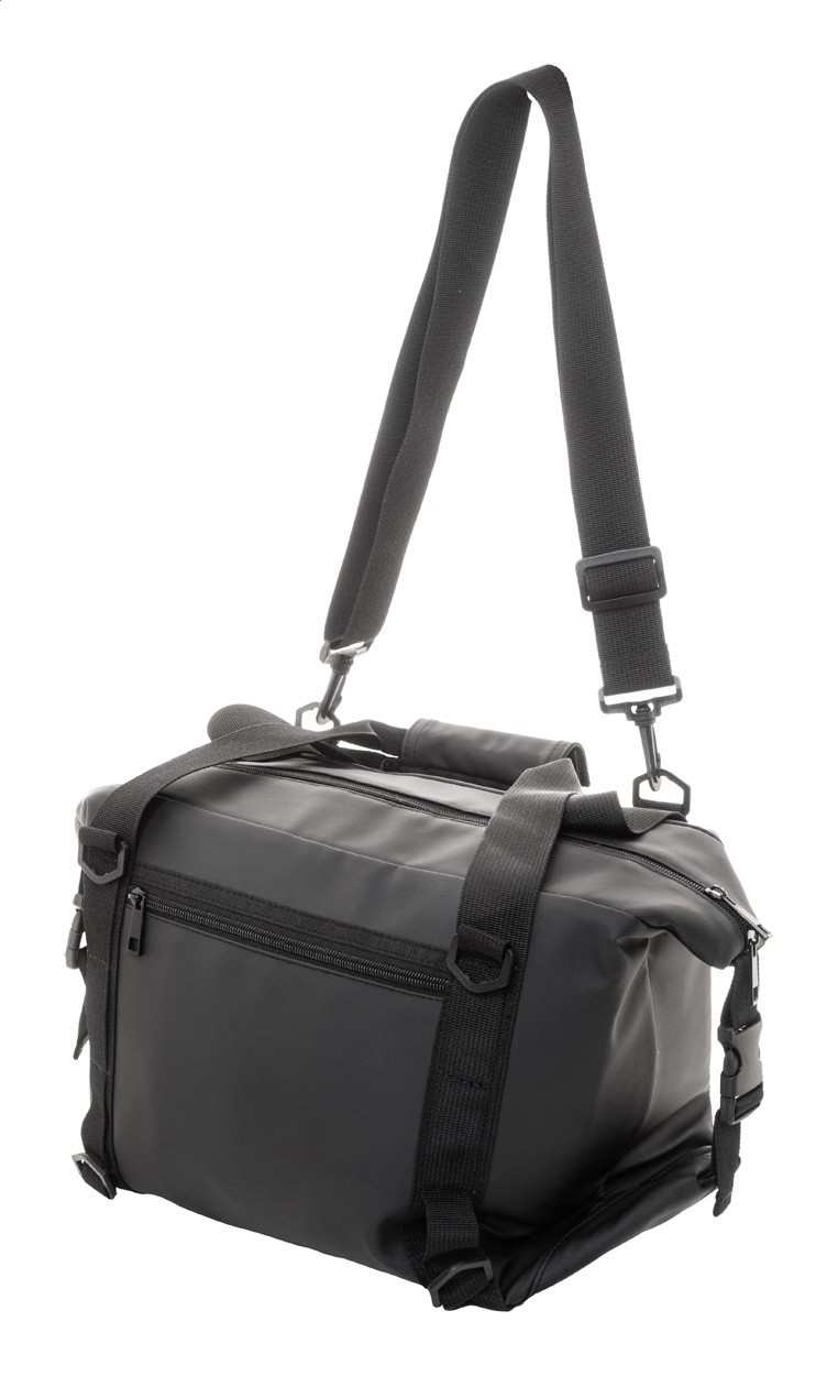 Geantă frigorifică pliabilă, cu fermoar, din piele moale PU reciclată, cu căptușeală din aluminiu și buzunar frontal cu fermoar. Cu catarame laterale, mânere și curea de umăr reglabilă. Geanta poate fi pliată pentru o depozitare ușoară sau fixată în formă cu cataramele laterale în timpul utilizării.