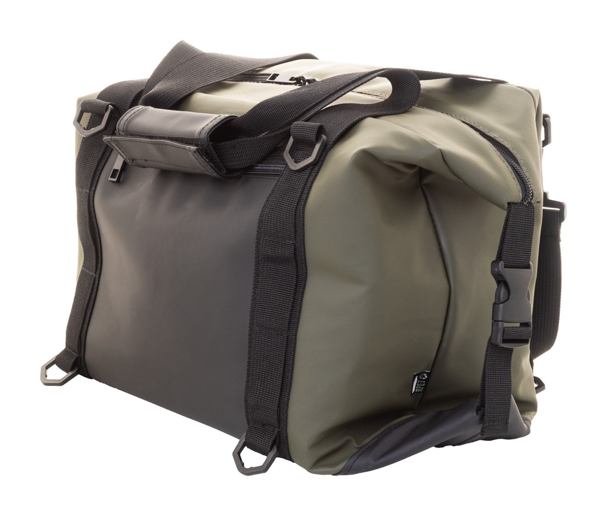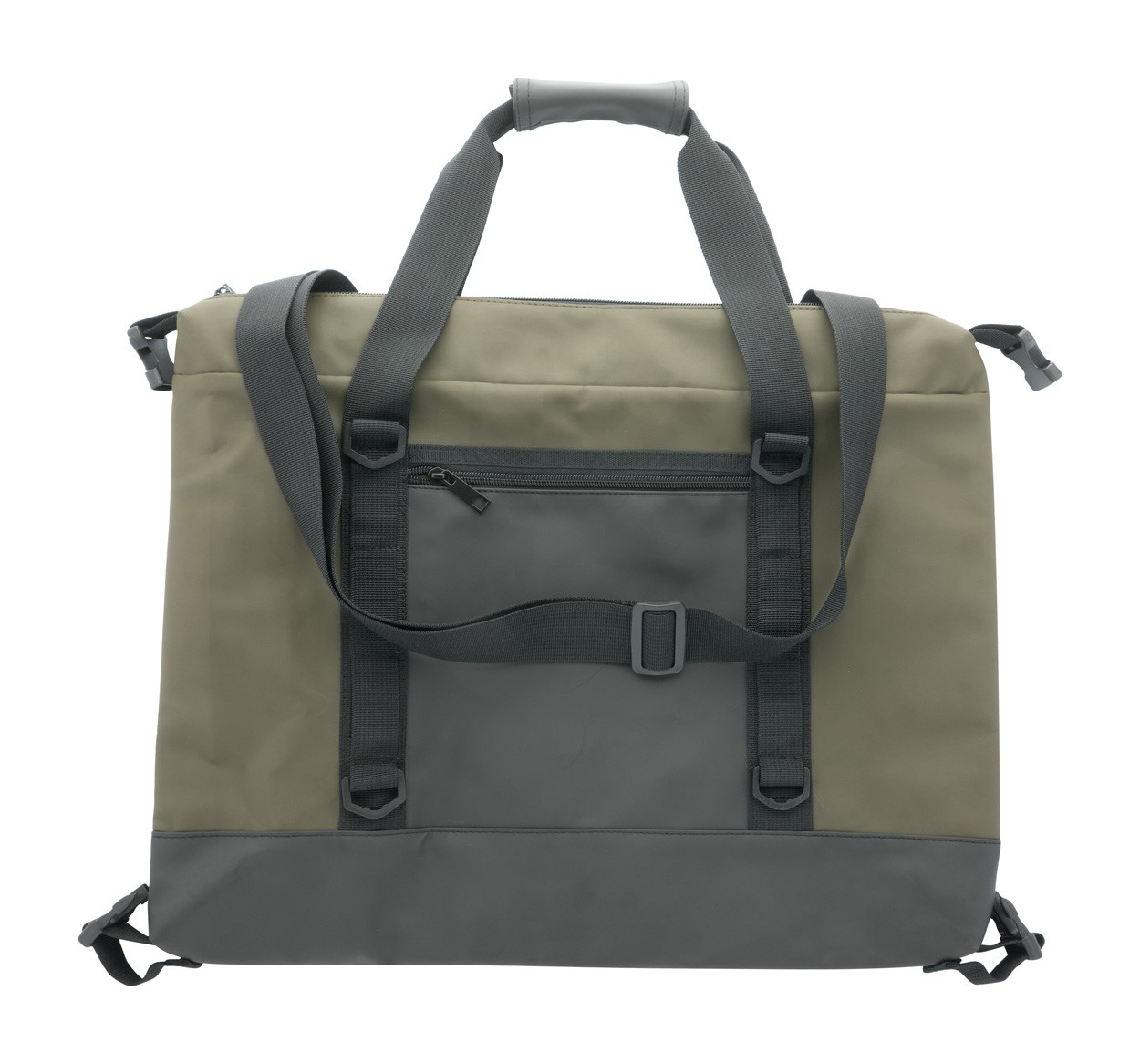 Geantă frigorifică pliabilă, cu fermoar, din piele moale PU reciclată, cu căptușeală din aluminiu și buzunar frontal cu fermoar. Cu catarame laterale, mânere și curea de umăr reglabilă. Geanta poate fi pliată pentru o depozitare ușoară sau fixată în formă cu cataramele laterale în timpul utilizării.