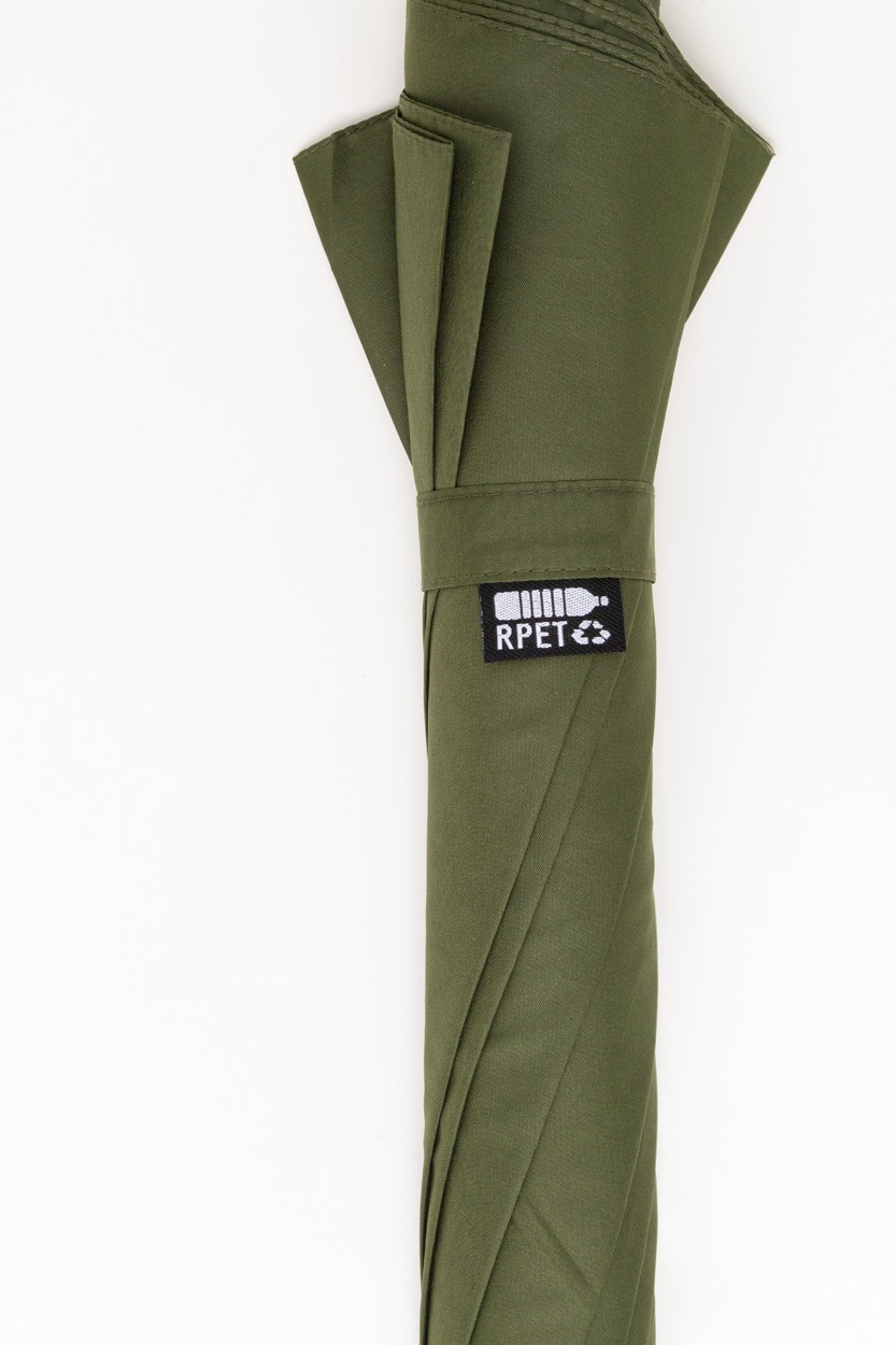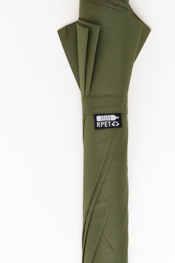 Umbrelă automată, rezistentă la vânt, cu 8 panouri, cadru din fibră de sticlă, ax metalic și mâner curbat ABS. Pongee 190T RPET. Cu etichetă distinctivă RPET.