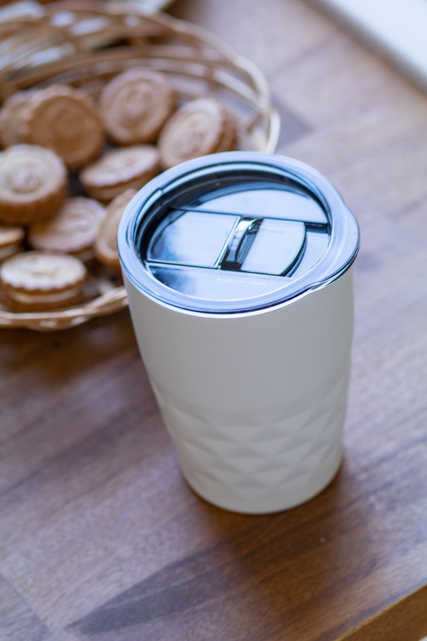 Cană termoizolantă, cu perete dublu din oțel inoxidabil, cu capac de băut din plastic. 350 ml. Izolația de cupru păstrează băuturile calde timp de 12 ore și reci timp de 24 ore.