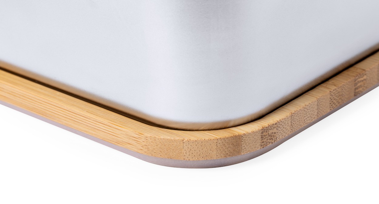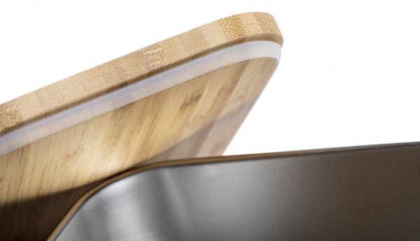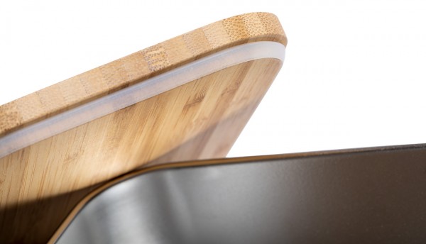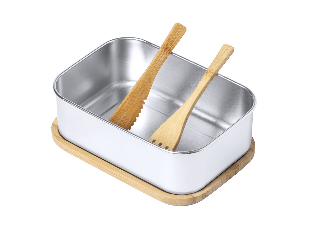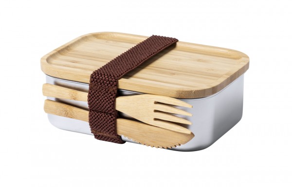 Cutie pentru pranz din otel inoxidabil cu capac din bambus natural. Cu un set de tacamuri din bambus (cutit si furculita) si curea elastica, 600 ml.